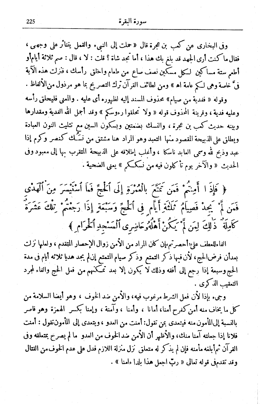 وَفِي الْبُخَارِيِّ عَنْ كَعْبِ بْنِ عُجْرَةَ قَالَ: «حُمِلْتُ إِلَى النَّبِيءِ وَالْقَمْلُ يَتَنَاثَرُ عَلَى وَجْهِي، فَقَالَ مَا كُنْتُ أَرَى الْجُهْدَ قَدْ بَلَغَ بِكَ هَذَا، أَمَا تَجِدُ شَاةً؟ قُلْتُ: لَا، قَالَ: صُمْ ثَلَاثَةَ أَيَّامٍ أَوْ أَطْعِمْ سِتَّةَ مَسَاكِينَ لِكُلِّ مِسْكِينٍ نِصْفُ صَاعٍ مِنْ طَعَامٍ وَاحْلِقْ رَأْسَكَ، فَنَزَلَتْ هَذِهِ الْآيَةُ