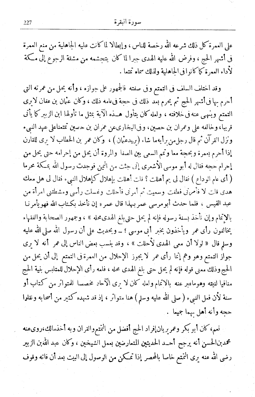 ، وَقَدْ يَنْسِبُ بَعْضُ النَّاسِ إِلَى عُمَرَ أَنَّهُ لَا يَرَى جَوَازَ التَّمَتُّعِ وَهُوَ وَهْمٌ إِنَّمَا رَأْيُ عُمَرَ لَا يَجُوزُ الْإِحْلَالُ مِنَ الْعُمْرَةِ فِي التَّمَتُّعِ إِلَى أَنْ يَحِلَّ مِنَ الْحَجِّ وَذَلِكَ مَعْنَى قَوْلِهِ فَإِنَّهُ لَمْ يَحِلَّ حَتَّى بَلَغَ الْهَدْيُ مَحِلَّهُ، فَلَعَلَّهُ رَأَى الْإِحْلَالَ لِلْمُتَلَبِّسِ بِنِيَّةِ الْحَجِّ مُنَافِيًا لِنِيَّتِهِ وَهُوَ مَا عَبَّرَ عَنْهُ بِالْإِتْمَامِ وَلَعَلَّهُ كَانَ لَا يَرَى الْآحَادَ مُخَصِّصًا لِلْمُتَوَاتِرِ مِنْ كِتَابٍ أَوْ سُنَّةٍ لِأَنَّ فِعْلَ النَّبِيءِ صَلَّى اللهُ عَلَيْهِ وَسَلَّمَ هُنَا مُتَوَاتِرٌ، إِذْ قَدْ شَهِدَهُ كَثِيرٌ مِنْ أَصْحَابِهِ وَنَقَلُوا حَجَّهُ وَأَنه أهل بهما جَمِيعًا.