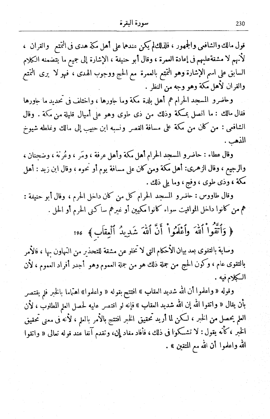 وَقَالَ الشَّافِعِيُّ: مَنْ كَانَ مِنْ مَكَّةَ عَلَى مَسَافَةِ الْقَصْرِ وَنَسَبَهُ ابْنُ حَبِيبٍ إِلَى مَالِكٍ وَغَلَّطَهُ شُيُوخُ الْمَذْهَبِ. وَقَالَ عَطَاءٌ: حَاضِرُو الْمَسْجِدِ الْحَرَامِ أَهْلُ مَكَّةَ وَأَهْلُ عَرَفَةَ، وَمَرٍّ، وَعُرَنَةَ، وَضَجْنَانَ، وَالرَّجِيعِ، وَقَالَ الزُّهْرِيُّ: أَهْلُ مَكَّةَ وَمَنْ كَانَ عَلَى مَسَافَةِ يَوْمٍ أَوْ نَحْوِهِ، وَقَالَ ابْنُ زَيْدٍ: أَهْلُ مَكَّةَ، وَذِي طُوًى، وَفَجٍّ، وَمَا يَلِي ذَلِك. وَقَالَ طَاوُوس: حَاضِرُو الْمَسْجِدِ الْحَرَامِ كُلُّ مَنْ كَانَ دَاخِلَ الْحَرَمِ، وَقَالَ أَبُو حَنِيفَةَ: هُمْ مَنْ كَانُوا دَاخِلَ الْمَوَاقِيتِ سَوَاءٌ كَانُوا مَكِّيِّينَ أَوْ غَيْرَهُمْ سَاكِنِي الْحَرَمِ أَوِ الْحِلِّ.