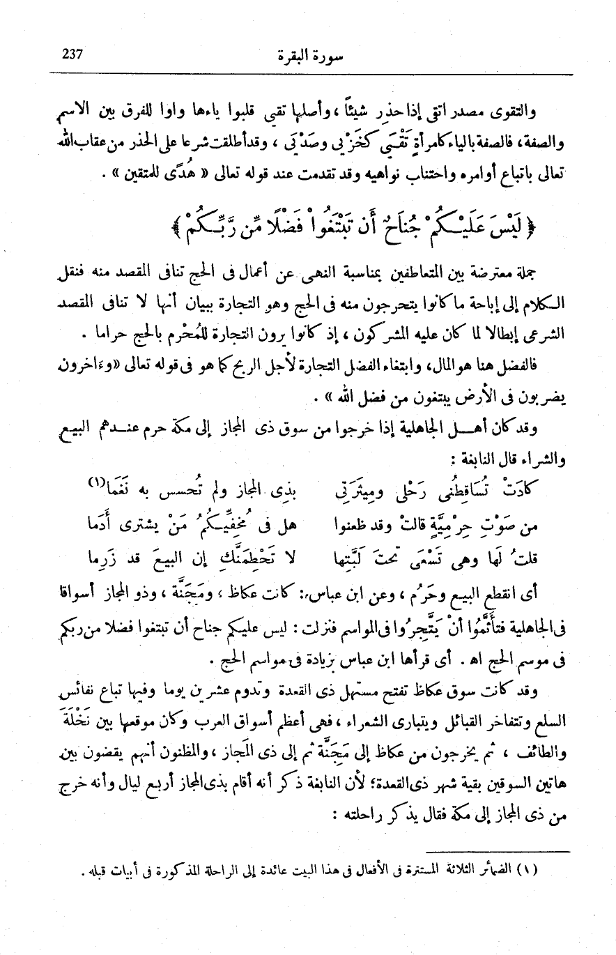 أَيِ انْقَطَعَ الْبَيْعُ وَحَرُمَ، وَعَنِ ابْنِ عَبَّاسٍ: كَانَتْ عُكَاظُ وَمَجَنَّةُ، وَذُو الْمَجَازِ أَسْوَاقًا فِي الْجَاهِلِيَّةِ فَتَأَثَّمُوا أَنْ يَتَّجِرُوا فِي الْمَوَاسِمِ فَنَزَلَتْ: (لَيْسَ عَلَيْكُمْ جُنَاحٌ أَنْ تَبْتَغُوا فَضْلًا مِنْ رَبِّكُمْ فِي موسم الْحَج) اهـ. أَيْ قَرَأَهَا ابْنُ عَبَّاسٍ بِزِيَادَة فِي مواسم الْحَجِّ.