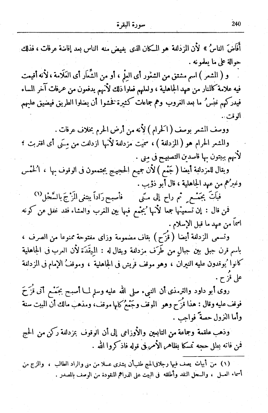 وَالْمَشْعَرُ الْحَرَامُ هُوَ (الْمُزْدَلِفَةُ) ، سُمِّيَتْ مُزْدَلِفَةَ لِأَنَّهَا ازْدَلَفَتْ مِنْ مِنًى أَيِ اقْتَرَبَتْ لِأَنَّهُمْ يَبِيتُونَ بِهَا قَاصِدِينَ التَّصْبِيحَ فِي مِنًى. وَيُقَالُ لِلْمُزْدَلِفَةِ أَيْضًا (جَمْعٌ) لِأَنَّ جَمِيعَ الْحَجِيجِ يَجْتَمِعُونَ فِي الْوُقُوفِ بِهَا، الْحُمْسُ وَغَيْرُهُمْ مِنْ عَهْدِ الْجَاهِلِيَّةِ، قَالَ أَبُو ذُؤَيْبٍ: