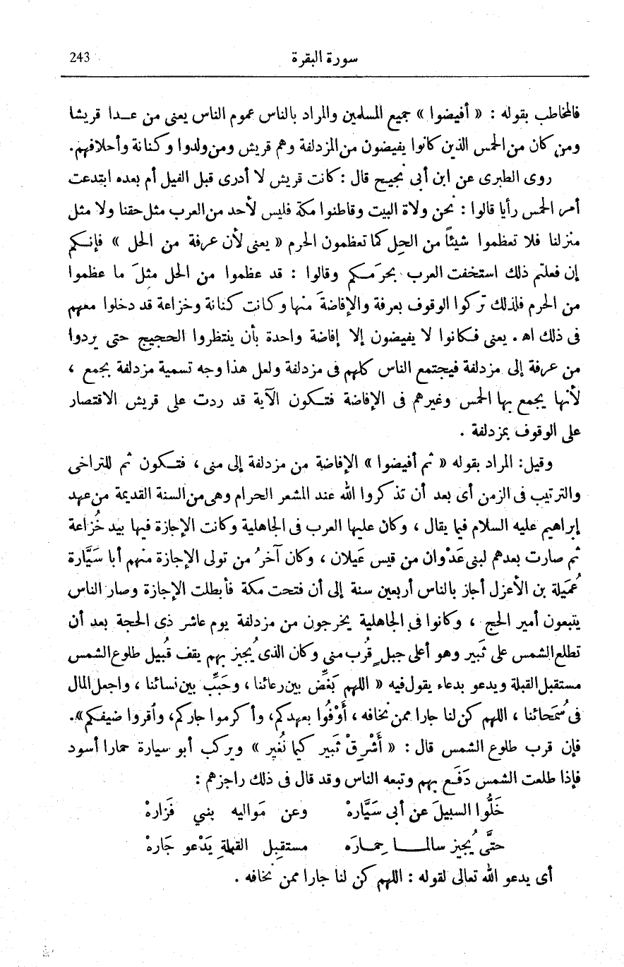 وَقِيلَ: الْمُرَادُ بِقَوْلِهِ: ثُمَّ أَفِيضُوا الْإِفَاضَةَ مِنْ مُزْدَلِفَةَ إِلَى مِنًى، فَتَكُونُ (ثُمَّ) لِلتَّرَاخِي وَالتَّرْتِيبِ فِي الزَّمَنِ أَيْ بَعْدَ أَنْ تَذْكُرُوا اللَّهَ عِنْدَ الْمَشْعَرِ الْحَرَامِ وَهِيَ مِنَ السُّنَّةِ الْقَدِيمَةِ مِنْ عَهْدِ إِبْرَاهِيمِ عَلَيْهِ السَّلَامُ فِيمَا يُقَالُ، وَكَانَ عَلَيْهَا الْعَرَبُ فِي الْجَاهِلِيَّة وَكَانَت الْإِجَازَةُ فِيهَا بِيَدِ خُزَاعَةَ ثُمَّ صَارَتْ بَعْدَهُمْ لِبَنِي عُدْوَانَ مِنْ قَيْسِ عَيْلَانَ، وَكَانَ آخِرُ مَنْ تَوَلَّى الْإِجَازَةَ مِنْهُمْ أَبَا سَيَّارَةَ عُمَيْلَةَ بْنَ الْأَعْزَلِ أَجَازَ بِالنَّاسِ أَرْبَعِينَ سَنَةً إِلَى أَنْ فُتِحَتْ مَكَّةَ فَأُبْطِلَتِ الْإِجَازَةُ وَصَارَ النَّاسُ يَتْبَعُونَ أَمِيرَ الْحَجِّ، وَكَانُوا فِي الْجَاهِلِيَّةِ يَخْرُجُونَ مِنْ مُزْدَلِفَةَ يَوْمَ عَاشِرِ ذِي الْحِجَّةِ بَعْدَ أَنْ تَطْلُعَ الشَّمْسُ عَلَى ثَبِيرَ وَهُوَ أَعْلَى جَبَلٍ قُرْبَ مِنًى وَكَانَ الَّذِي يُجِيزُ بِهِمْ يَقِفُ قُبَيْلَ طُلُوعِ الشَّمْسِ مُسْتَقْبِلَ الْقِبْلَةِ وَيَدْعُو بِدُعَاءٍ يَقُولُ فِيهِ: «اللَّهُمَّ بَغِّضْ بَيْنَ رِعَائِنَا، وَحَبِّبْ بَيْنَ نِسَائِنَا، وَاجْعَلِ الْمَالَ فِي سُمَحَائِنَا، اللَّهُمَّ كُنْ لَنَا جَارًا مِمَّنْ نَخَافُهُ، أَوْفَوْا بِعَهْدِكُمْ، وَأَكْرِمُوا جَارَكُمْ، وَاقْرُوا ضَيْفَكُمْ» ، فَإِنْ قَرُبَ طُلُوعُ الشَّمْسِ قَالَ: «أَشْرِقْ ثَبِيرُ كَيْمَا نُغِيرُ» وَيَرْكَبُ أَبُو سَيَّارَةَ حِمَارًا أَسْوَدَ فَإِذَا طَلَعَتِ الشَّمْسُ دَفَعَ بِهِمْ وَتَبِعَهُ النَّاسُ وَقَدْ قَالَ فِي ذَلِكَ رَاجِزُهُمْ: