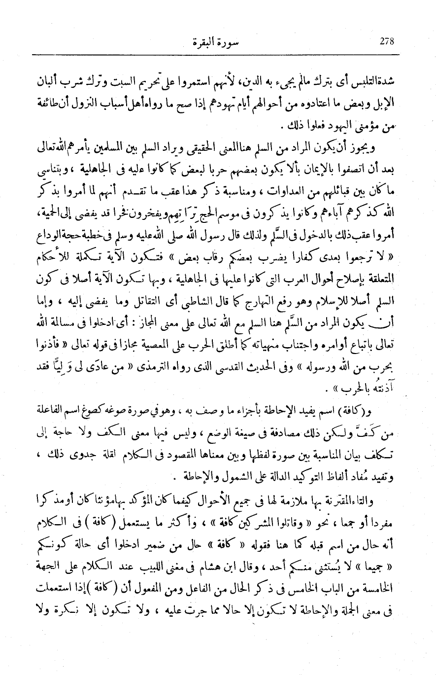وَعَنْ أَبِي عَمْرِو بْنِ الْعَلَاءِ السِّلْمُ بِكَسْرِ السِّينِ هُوَ الْإِسْلَامُ وَالسَّلْمُ بِفَتْحِ السِّينِ الْمُسَالَمَةُ، وَلِذَلِكَ قَرَأَ ادْخُلُوا فِي السِّلْمِ فِي هَذِهِ السُّورَةِ بِكَسْرِ السِّينِ لَا غَيْرَ وَقَرَأَ الَّتِي فِي سُورَةِ الْأَنْفَالِ وَالَّتِي فِي سُورَةِ مُحَمَّدٍ صَلَّى اللهُ عَلَيْهِ وَسَلَّمَ بِفَتْحِ السِّينِ قَالَ الطَّبَرِيُّ تَوْجِيهًا مِنْهُ لِمَعْنَاهُ هُنَا إِلَى أَنَّهُ الْإِسْلَامُ دُونَ الْآيَتَيْنِ الْأُخْرَيَيْنِ. وَأَنْكَرَ الْمُبَرِّدُ هَذِهِ التَّفْرِقَةَ وَقَالَ: اللُّغَةُ لَا تُؤْخَذُ هَكَذَا وَإِنَّمَا تُؤْخَذُ بِالسَّمَاعِ لَا بِالْقِيَاسِ وَيَحْتَاجُ مَنْ فَرَّقَ إِلَى دَلِيلٍ. فَكَوْنُ السِّلْمِ مِنْ أَسْمَاءِ الصُّلْحِ لَا خِلَافَ فِيهِ بَيْنَ أَئِمَّةِ اللُّغَةِ فَهُوَ مُرَادٌ مِنَ الْآيَةِ لَا مَحَالَةَ وَكَوْنُهُ يُطْلَقُ عَلَى الْإِسْلَامِ إِذَا صَحَّ ذَلِك جَازَ أَي يَكُونَ مُرَادًا أَيْضًا وَيَكُونُ مِنَ اسْتِعْمَالِ الْمُشْتَرَكِ فِي مَعْنَيَيْهِ. فَعَلَى أَنْ يَكُونَ الْمُرَادُ بِالسِّلْمِ الْمُسَالَمَةَ كَمَا يَقْتَضِيهِ خِطَابُهُمْ بِيَا أَيُّهَا الَّذِينَ آمَنُوا الَّذِي هُوَ كَاللَّقَبِ لِلْمُسْلِمِينَ كَانَ الْمَعْنَى أَمْرَهُمْ بِالدُّخُولِ فِي الْمُسَالَمَةِ دُونَ الْقِتَالِ، وَكَمَا تَقْتَضِيهِ صِيغَةُ الْأَمْرِ فِي (ادْخُلُوا) مِنْ أَنَّ حَقِيقَتَهَا طَلَبُ تَحْصِيلِ فِعْلٍ لَمْ يَكُنْ حَاصِلًا أَوْ كَانَ مُفَرَّطًا فِي بَعْضِهِ.