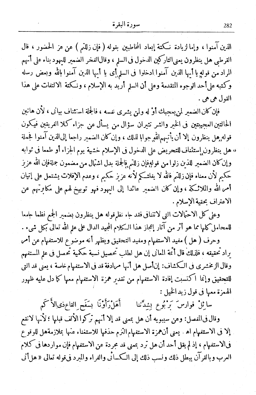 وَلَكَ أَنْ تَجْعَلَ قَوْلَهُ: فَاعْلَمُوا تَنْزِيلًا لِعِلْمِهِمْ مَنْزِلَةَ الْعَدَمِ لِعَدَمِ جَرْيِهِمْ عَلَى مَا يَقْتَضِيهِ مِنَ الْمُبَادَرَةِ إِلَى الدُّخُولِ فِي الدِّينِ أَوْ لِمُخَالَفَةِ أَحْكَامِ الدِّينِ أَوْ مِنَ الِامْتِعَاضِ بِالصُّلْحِ الَّذِي عَقَدَهُ الرَّسُولُ.