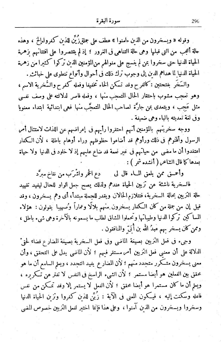 وَمَعْنَى تَزْيِينِ الْحَيَاةِ لَهُمْ، إِمَّا أَنَّ مَا خُلِقَ زَيْنًا فِي الدُّنْيَا قَدْ تَمَكَّنَ مِنْ نُفُوسِهِمْ وَاشْتَدَّ تَوَغُّلُهُمْ فِي اسْتِحْسَانِهِ، لِأَنَّ الْأَشْيَاءَ الزَّيْنَةَ هِيَ حَسَنَةٌ فِي أَعْيُنِ جَمِيعِ النَّاسِ فَلَا يَخْتَصُّ الَّذِينَ كَفَرُوا بِجَعْلِهَا لَهُمْ زَيْنَةً كَمَا هُوَ مُقْتَضَى قَوْلِهِ: لِلَّذِينَ كَفَرُوا فَإِنَّ اللَّامَ تُشْعِرُ بِالِاخْتِصَاصِ، وَإِمَّا تَرْوِيجُ تَزْيِينِهَا فِي نُفُوسِهِمْ بِدَعْوَةٍ شَيْطَانِيَّةٍ تُحَسِّنُ مَا لَيْسَ بِالْحَسَنِ كَالْأَقْيِسَةِ الشِّعْرِيَّةِ وَالْخَوَاطِرِ الشَّهْوِيَّةِ.