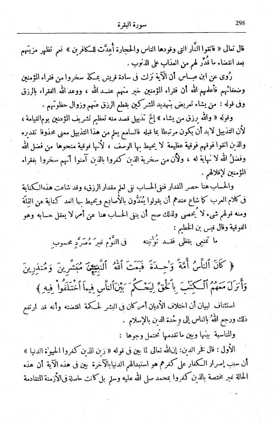 وَقَوْلُهُ: وَيَسْخَرُونَ مِنَ الَّذِينَ آمَنُوا عَطْفٌ عَلَى جُمْلَةِ زُيِّنَ لِلَّذِينَ كَفَرُوا إِلَخْ، وَهَذِهِ حَالَةٌ أَعْجَبُ مِنَ الَّتِي قَبْلَهَا وَهِيَ حَالَةُ التَّنَاهِي فِي الْغُرُورِ إِذْ لَمْ يَقْتَصِرُوا عَلَى افْتِتَانِهِمْ بِزَهْرَةِ الْحَيَاةِ الدُّنْيَا حَتَّى سَخِرُوا بِمَنْ لَمْ يَنْسِجْ عَلَى مِنْوَالِهِمْ مِنَ الْمُؤْمِنِينَ الَّذِينَ تَرَكُوا كَثِيرًا مِنْ زَهْرَةِ الْحَيَاةِ الدُّنْيَا لِمَا هَدَاهُمُ الدِّينُ إِلَى وُجُوبِ تَرْكِ ذَلِكَ فِي أَحْوَالٍ وَأَنْوَاعٍ تَنْطَوِي عَلَى خَبَائِثَ.