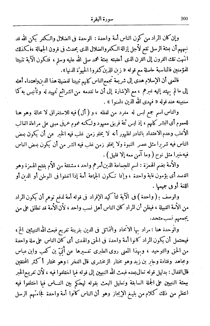 كانَ النَّاسُ أُمَّةً واحِدَةً فَبَعَثَ اللَّهُ النَّبِيِّينَ مُبَشِّرِينَ وَمُنْذِرِينَ وَأَنْزَلَ مَعَهُمُ الْكِتابَ بِالْحَقِّ لِيَحْكُمَ بَيْنَ النَّاسِ فِيمَا اخْتَلَفُوا فِيهِ وَمَا اخْتَلَفَ فِيهِ إِلاَّ الَّذِينَ أُوتُوهُ مِنْ بَعْدِ مَا جاءَتْهُمُ الْبَيِّناتُ بَغْياً بَيْنَهُمْ فَهَدَى اللَّهُ الَّذِينَ آمَنُوا لِمَا اخْتَلَفُوا فِيهِ مِنَ الْحَقِّ بِإِذْنِهِ وَاللَّهُ يَهْدِي مَنْ يَشاءُ إِلى صِراطٍ مُسْتَقِيمٍ (213)
