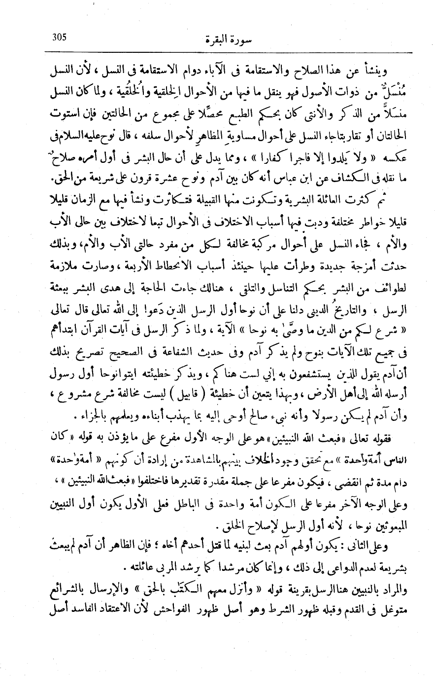 حَدَثَ فِي أَهْلِ الْأَرْضِ وَعَمَّهُمْ عَاجِلًا فَبَعَثَ اللَّهُ نُوحًا إِلَيْهِمْ ثُمَّ أَهْلَكَ الْكَافِرِينَ مِنْهُمْ بِالطُّوفَانِ وَنَجَّى نُوحًا وَنَفَرًا مَعَهُ فَأَصْبَحَ جَمِيعُ النَّاسِ صَالِحِينَ، ثُمَّ اخْتَلَفُوا بَعْدَ ذَلِكَ فَبَعَثَ اللَّهُ النَّبِيِّينَ. فَيَجْدُرُ بِنَا أَنْ نَنْظُرَ الْآنَ فِيمَا تَضَمَّنَتْهُ هَذِهِ الْآيَةُ مِنَ الْمَعْنَى فِي تَارِيخِ ظُهُورِ الشَّرَائِعِ وَفِي أَسْبَابِ ذَلِكَ.