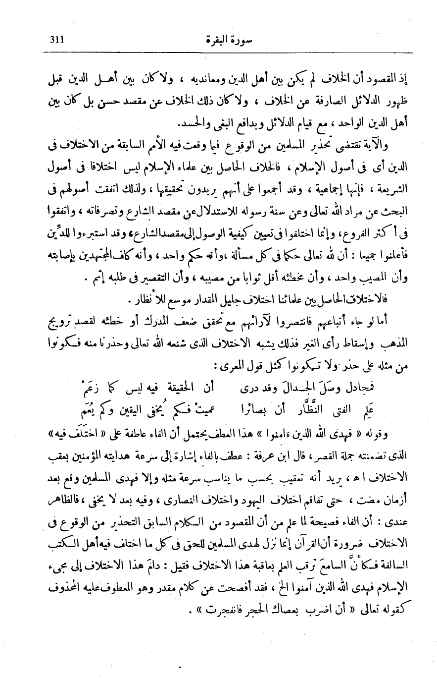 وَالتَّعْرِيضُ بِأَهْلِ الْكِتَابِ وَهُمْ أَشْهَرُ أَهْلِ الشَّرَائِعِ يَوْمَئِذٍ فِيمَا صَنَعُوا بِكُتُبِهِمْ مِنَ الِاخْتِلَافِ فِيهَا، وَهَذَا مِنْ بَدِيعِ اسْتِطْرَادِ الْقُرْآنِ فِي تَوْبِيخِ أَهْلِ الْكِتَابِ وَخَاصَّةً الْيَهُودَ وَهِيَ طَرِيقَةٌ عَرَبِيَّةٌ بَلِيغَةٌ قَالَ زُهَيْرٌ: