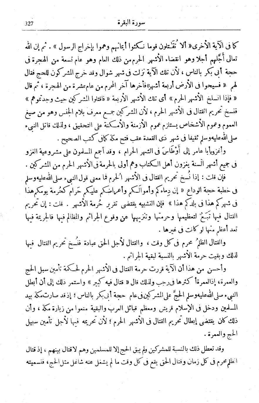 قِتالٍ فِيهِ، وَهُوَ بَدَلُ اشْتِمَالٍ فَيَجُوزُ فِيهِ إِبْدَالُ النَّكِرَةِ مِنَ الْمَعْرِفَةِ، بِخِلَافِ بَدَلِ الْبَعْضِ عَلَى أَنَّ وَصْفَ النَّكِرَةِ هُنَا بِقَوْلِهِ (فِيهِ) يَجْعَلُهَا فِي قُوَّةِ الْمَعْرِفَةِ. فَالْمُرَادُ بَيَانُ أَيِّ شَهْرٍ كَانَ مِنَ الْأَشْهُرِ الْحُرُمِ وَأَيِّ قِتَالٍ، فَإِنْ كَانَ السُّؤَالُ إِنْكَارِيًّا مِنَ الْمُشْرِكِينَ فَكَوْنُ الْمُرَادِ جِنْسَ هَذِهِ الْأَشْهُرِ ظَاهِرٌ، وَإِنْ كَانَ اسْتِفْسَارًا مِنَ الْمُسْلِمِينَ فَكَذَلِكَ، وَمُجَرَّدُ كَوْنِ الْوَاقِعَةِ الَّتِي تَسَبَّبَ عَلَيْهَا السُّؤَالُ وَقَعَتْ فِي شَهْرٍ مُعَيَّنٍ لَا يَقْتَضِي تَخْصِيصَ السُّؤَالِ بِذَلِكَ الشَّهْرِ، إِذْ لَا يَخْطُرُ بِبَالِ السَّائِلِ بَلِ الْمَقْصُودُ السُّؤَالُ عَنْ دَوَامِ هَذَا الْحُكْمِ الْمُتَقَرِّرِ عِنْدَهُمْ قَبْلَ الْإِسْلَامِ وَهُوَ لَا يَخْتَصُّ بِشَهْرٍ دُونَ شَهْرٍ.