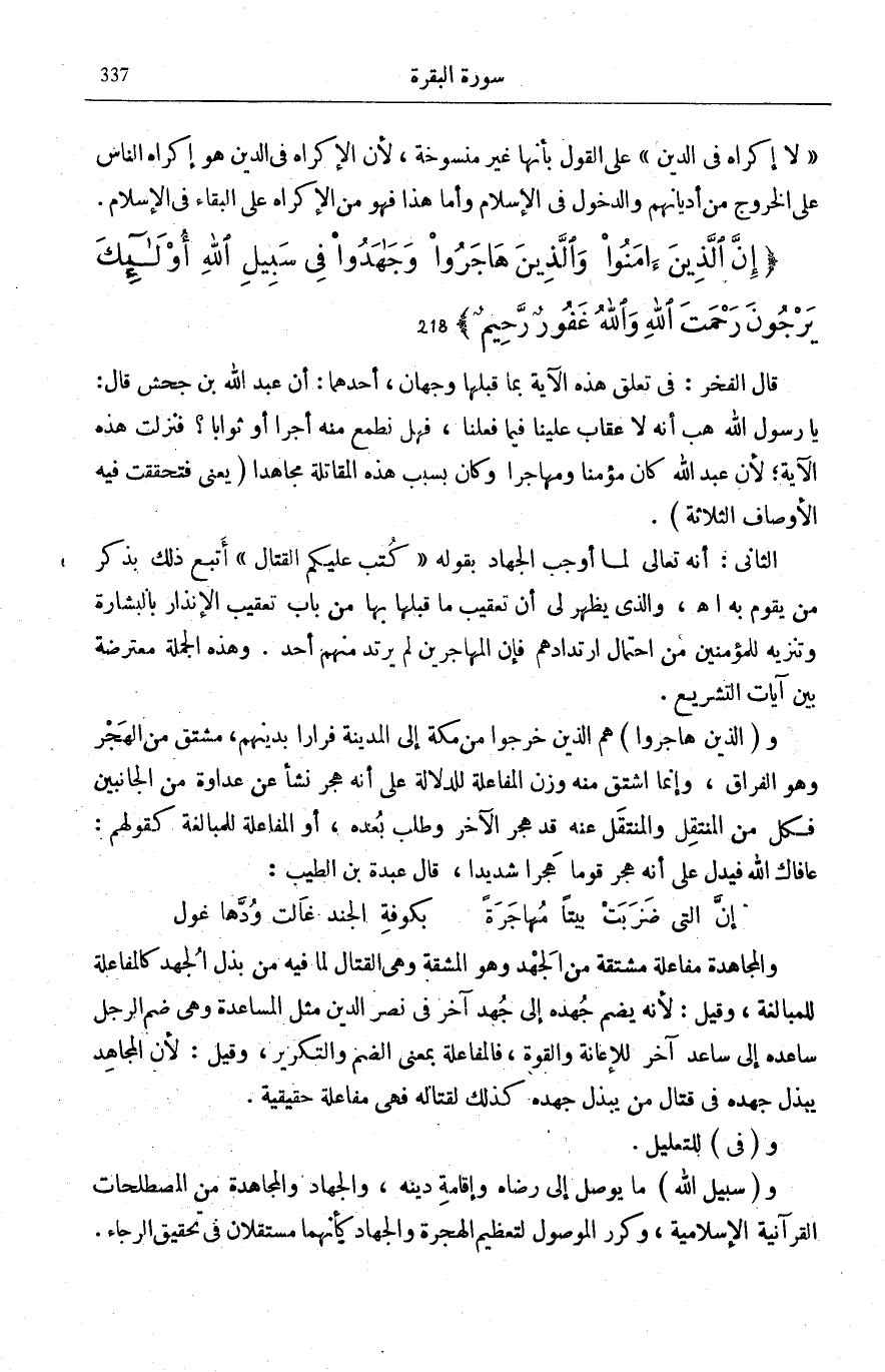 فَإِنْ قُلْتَ: مَا السِّرُّ فِي اقْتِرَانِ هَذَيْنِ الشَّرْطَيْنِ فِي هَذِهِ الْآيَةِ مَعَ خُلُوِّ بَقِيَّةِ نَظَائِرِهَا عَنْ ثَانِي الشَّرْطَيْنِ، قُلْتُ: تِلْكَ الْآيُ الْأُخَرُ جَاءَتْ لِتَهْوِيلِ أَمْرِ الشِّرْكِ عَلَى فَرْضِ وُقُوعِهِ مِنْ غَيْرِ مُعَيَّنٍ كَمَا فِي آيَةِ وَمَنْ يَكْفُرْ بِالْإِيمانِ [الْمَائِدَة: 5] أَوْ وُقُوعِهِ مِمَّنْ يَسْتَحِيلُ وُقُوعُهُ مِنْهُ كَمَا فِي آيَةِ: وَلَوْ أَشْرَكُوا لَحَبِطَ عَنْهُمْ مَا كانُوا يَعْمَلُونَ [الْأَنْعَام: 88] وَآيَةِ لَئِنْ أَشْرَكْتَ لَيَحْبَطَنَّ عَمَلُكَ [الزمر: 65] فَاقْتَصَرَ فِيهَا عَلَى مَا يَنْشَأُ عَنِ الشِّرْكِ بَعْدَ الْإِيمَانِ مِنْ حَبَطِ الْأَعْمَالِ، وَمِنَ الْخَسَارَةِ بِإِجْمَالٍ، أَمَّا هَذِهِ الْآيَةُ فَقَدْ وَرَدَتْ عَقِبَ ذِكْرِ مُحَاوَلَةِ الْمُشْرِكِينَ وَمُعَالَجَتِهِمُ ارْتِدَادَ الْمُسْلِمِينَ الْمُخَاطَبِينَ بِالْآيَةِ، فَكَانَ فَرْضُ وُقُوعِ الشِّرْكِ وَالِارْتِدَادِ مِنْهُمْ أَقْرَبَ، لِمُحَاوَلَةِ الْمُشْرِكِينَ ذَلِكَ بِقِتَالِ الْمُسْلِمِينَ، فَذُكِرَ فِيهَا زِيَادَةَ تَهْوِيلٍ وَهُوَ الْخُلُودُ فِي النَّارِ.