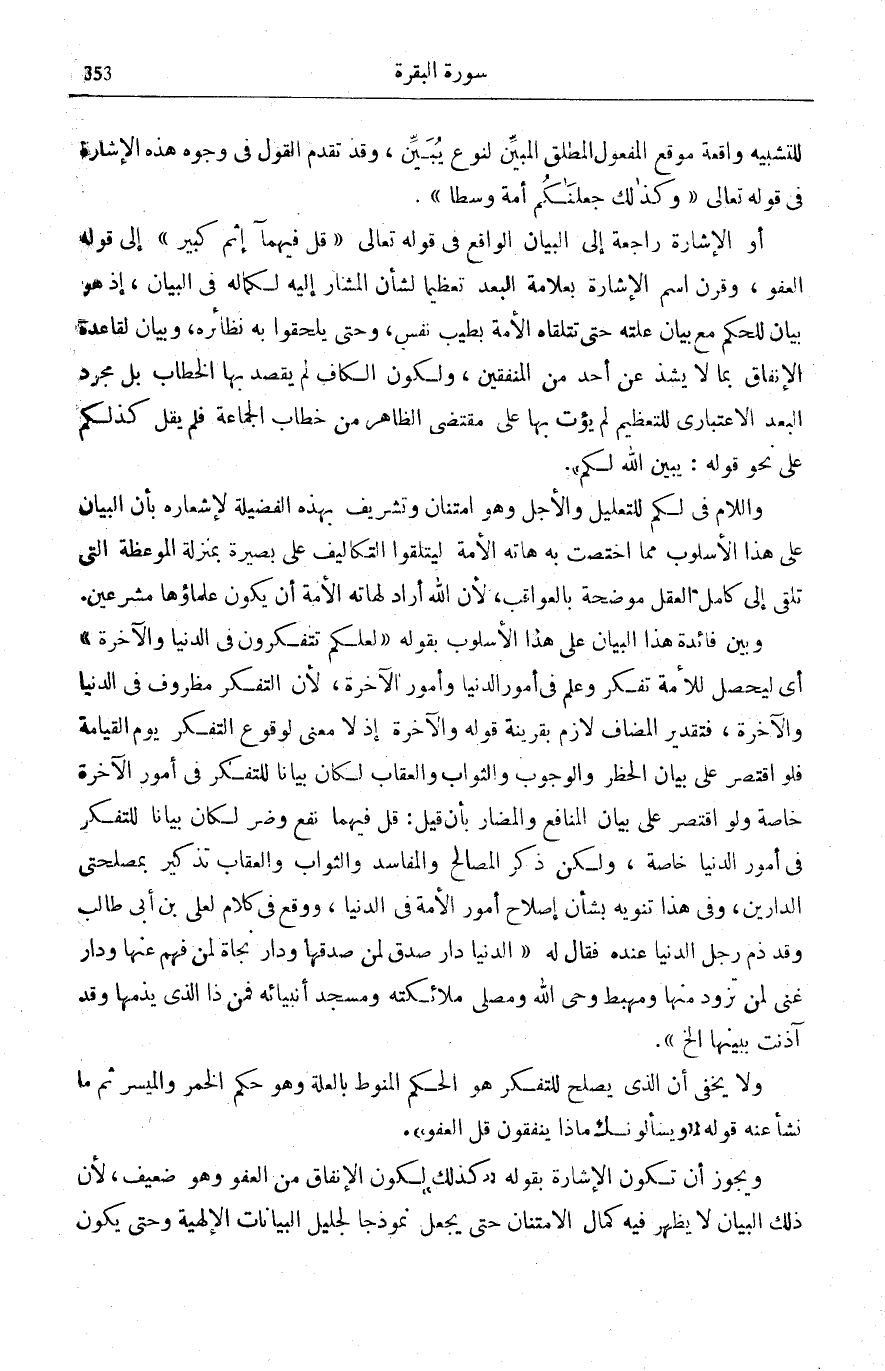 وَيَسْأَلُونَكَ مَاذَا يُنْفِقُونَ قُلِ الْعَفْوَ كَذلِكَ يُبَيِّنُ اللَّهُ لَكُمُ الْآياتِ لَعَلَّكُمْ تَتَفَكَّرُونَ فِي الدُّنْيا وَالْآخِرَةِ كَانَ سُؤَالُهُمْ عَنِ الْخَمْرِ وَالْمَيْسِرِ حَاصِلًا مَعَ سُؤَالِهِمْ مَاذَا يُنْفِقُونَ، فَعُطِفَتِ الْآيَةُ الَّتِي فِيهَا جَوَابُ سُؤَالِهِمْ مَاذَا يُنْفِقُونَ عَلَى آيَةِ الْجَوَابِ عَنْ سُؤَالِ الْخَمْرِ وَالْمَيْسِرِ، وَلِذَلِكَ خُولِفَ الْأُسْلُوبُ الَّذِي سَلَفَ فِي الْآيَاتِ الْمُخْتَلفَة بجمل يَسْئَلُونَكَ بِدُونِ عَطْفٍ فَجِيءَ بِهَذِهِ مَعْطُوفَةً بِالْوَاوِ عَلَى الَّتِي قَبْلَهَا.