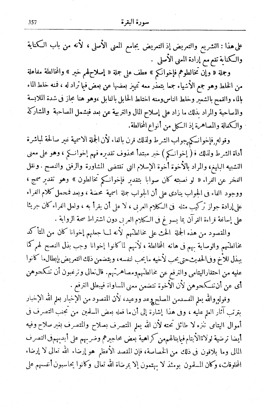 ذَلِكَ لِرَسُولِ اللَّهِ فَأنْزل الله وَيَسْئَلُونَكَ عَنِ الْيَتامى الْآيَةَ مَعَ أَنَّ سُورَةَ النِّسَاءِ نَزَلَتْ بَعْدَ سُورَةِ الْبَقَرَةِ، فَلَعَلَّ ذِكْرَ آيَةِ النِّسَاءِ وَهْمٌ مِنَ الرَّاوِي وَإِنَّمَا أَرَادَ أَنَّهُ لَمَّا نَزَلَتِ الْآيَاتُ الْمُحَذِّرَةُ مِنْ مَالِ الْيَتِيمِ مِثْلُ آيَةِ سُورَةِ الْإِسْرَاءِ [34] وَلا تَقْرَبُوا مالَ الْيَتِيمِ إِلَّا بِالَّتِي هِيَ أَحْسَنُ فَفِي «تَفْسِير الطَّبَرِيّ» بِسَنَدِهِ إِلَى ابْنِ عَبَّاسٍ: لَمَّا نَزَلَتْ: وَلا تَقْرَبُوا مالَ الْيَتِيمِ إِلَّا بِالَّتِي هِيَ أَحْسَنُ عَزَلُوا أَمْوَالَ الْيَتَامَى فَذَكَرُوا ذَلِكَ لِرَسُولِ اللَّهِ فَنَزَلَتْ وَإِنْ تُخالِطُوهُمْ أَوْ أَنَّ مُرَادَ الرَّاوِي لَمَّا سَمِعَ النَّاسُ آيَةَ سُورَةِ النِّسَاءِ تَجَنَّبُوا النَّظَرَ فِي الْيَتَامَى فَذُكِّرُوا بِآيَةِ الْبَقَرَةِ إِنْ كَانَ السَّائِلُ عَنْ آيَةِ الْبَقَرَةِ غَيْرَ الْمُتَجَنِّبِ حِينَ نُزُولِ آيَةِ النِّسَاءِ وَأَيًّا مَا كَانَ فَقَدْ ثَبَتَ أَنَّ النَّظَرَ فِي مَصَالِحِ الْأَيْتَامِ مِنْ أَهَمِّ مَقَاصِدِ الشَّرِيعَةِ فِي حِفْظِ النِّظَامِ فَقَدْ كَانَ