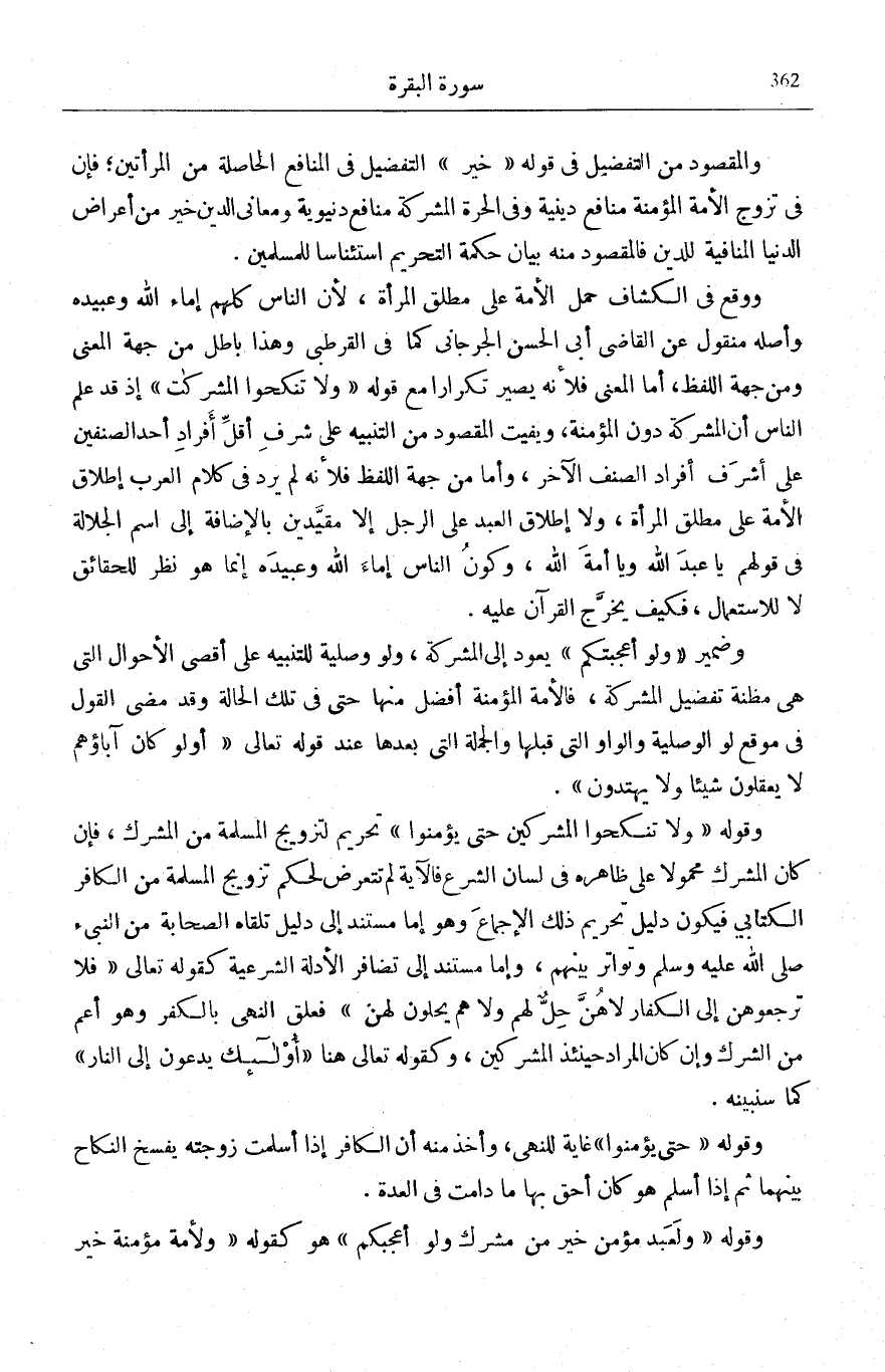 الْكِتَابِيَّ فَالْآيَةُ سَاكِتَةٌ عَنْهُ، لِأَنَّ لَفْظَ الْمُشْرِكِ لَقَبٌ لَا مَفْهُومَ لَهُ إِلَّا إِذَا جَرَى عَلَى مَوْصُوفٍ كَمَا سَنُبَيِّنُهُ عِنْدَ قَوْلِهِ تَعَالَى: خَيْرٌ مِنْ مُشْرِكٍ، وَقَدْ أَذِنَ الْقُرْآنُ بِجَوَازِ تَزَوُّجِ الْمُسْلِمِ الْكِتَابِيَّةَ فِي قَوْلِهِ: وَالْمُحْصَناتُ مِنَ الَّذِينَ أُوتُوا الْكِتابَ مِنْ قَبْلِكُمْ [الْمَائِدَة: 5] فِي سُورَةِ الْعُقُودِ فَلِذَلِكَ قَالَ جُمْهُورُ الْعُلَمَاءِ بِجَوَازِ تَزَوُّجِ الْمُسْلِمِ الْكِتَابِيَّةَ دُونَ الْمُشْرِكَةِ وَالْمَجُوسِيَّةِ وَعَلَى هَذَا الْأَئِمَّةُ الْأَرْبَعَةُ وَالْأَوْزَاعِيُّ وَالثَّوْرِيُّ، فَبَقِيَ تَزْوِيجُ الْمُسْلِمَةِ مِنَ الْكِتَابِيِّ لَا نَصَّ عَلَيْهِ وَمَنَعَهُ جَمِيعُ الْمُسْلِمِينَ إِمَّا اسْتِنَادًا مِنْهُمْ إِلَى الِاقْتِصَارِ فِي مَقَامِ بَيَانِ التَّشْرِيعِ وَإِمَّا إِلَى أَدِلَّةٍ مِنَ السُّنَّةِ وَمِنَ الْقِيَاسِ وَسَنُشِيرُ إِلَيْهِ أَوْ مِنَ الْإِجْمَاعِ وَهُوَ أَظْهَرُ. وَذَهَبَتْ طَوَائِفُ مِنْ أَهْلِ الْعِلْمِ إِلَى الِاسْتِدْلَالِ لِفِقْهِ هَذِهِ الْمَسْأَلَةِ بِطَرِيقَةٍ أُخْرَى فَقَالُوا أَهْلُ الْكِتَابِ صَارُوا مُشْرِكِينَ لِقَوْلِ الْيَهُودِ عُزَيْرٌ ابْنُ اللَّهِ وَلِقَوْلِ النَّصَارَى الْمَسِيحُ ابْنُ اللَّهِ وَأُبُوَّةُ الْإِلَهِ تَقْتَضِي أُلُوهِيَّةَ الِابْنِ، وَإِلَى هَذَا الْمَعْنَى جَنَحَ عَبْدُ اللَّهِ بْنُ عُمَرَ فَفِي «الْمُوَطَّأِ» عَنْهُ «لَاَ أَعْلَمُ شِرْكًا أَعْظَمَ مِنْ أَنْ تَقُولَ الْمَرْأَةُ رَبُّهَا عِيسَى» وَلَكِنَّ هَذَا مَسْلَكٌ ضَعِيفٌ جِدًّا، لِأَنَّ إِدْخَالَ أَهْلِ الْكِتَابِ فِي مَعْنَى الْمُشْرِكِينَ بَعِيدٌ عَنِ الِاصْطِلَاحِ الشَّرْعِيِّ، وَنَزَلَتْ هَذِهِ الْآيَةُ وَأَمْثَالُهَا وَهُوَ مَعْلُومٌ فَاشٍ، وَلِأَنَّهُ إِذَا تَمَّ فِي النَّصَارَى بِاطِّرَادٍ فَهُوَ لَا يَتِمُّ فِي الْيَهُودِ، لِأَنَّ الَّذِينَ قَالُوا عُزَيْرٌ ابْنُ اللَّهِ إِنَّمَا هُمْ طَائِفَةٌ قَلِيلَةٌ مِنَ الْيَهُودِ وَهُمْ أَتْبَاعُ (فِنْحَاصٍ) كَمَا حَكَاهُ الْفَخْرُ فَإِذَا كَانَتْ هَذِهِ الْآيَةُ تَمْنَعُ أَنْ يَتَزَوَّجَ الْمُسْلِمُ امْرَأَةً يَهُودِيَّةً أَوْ نَصْرَانِيَّةً وَأَنْ يُزَوَّجَ أَحَدٌ مِنَ الْيَهُودِ وَالنَّصَارَى مُسْلِمَةً فَإِنَّ آيَةَ سُورَةِ الْعُقُودِ خَصَّصَتْ عُمُومَ الْمَنْعِ بِصَرِيحِ قَوْلِهِ: وَالْمُحْصَناتُ