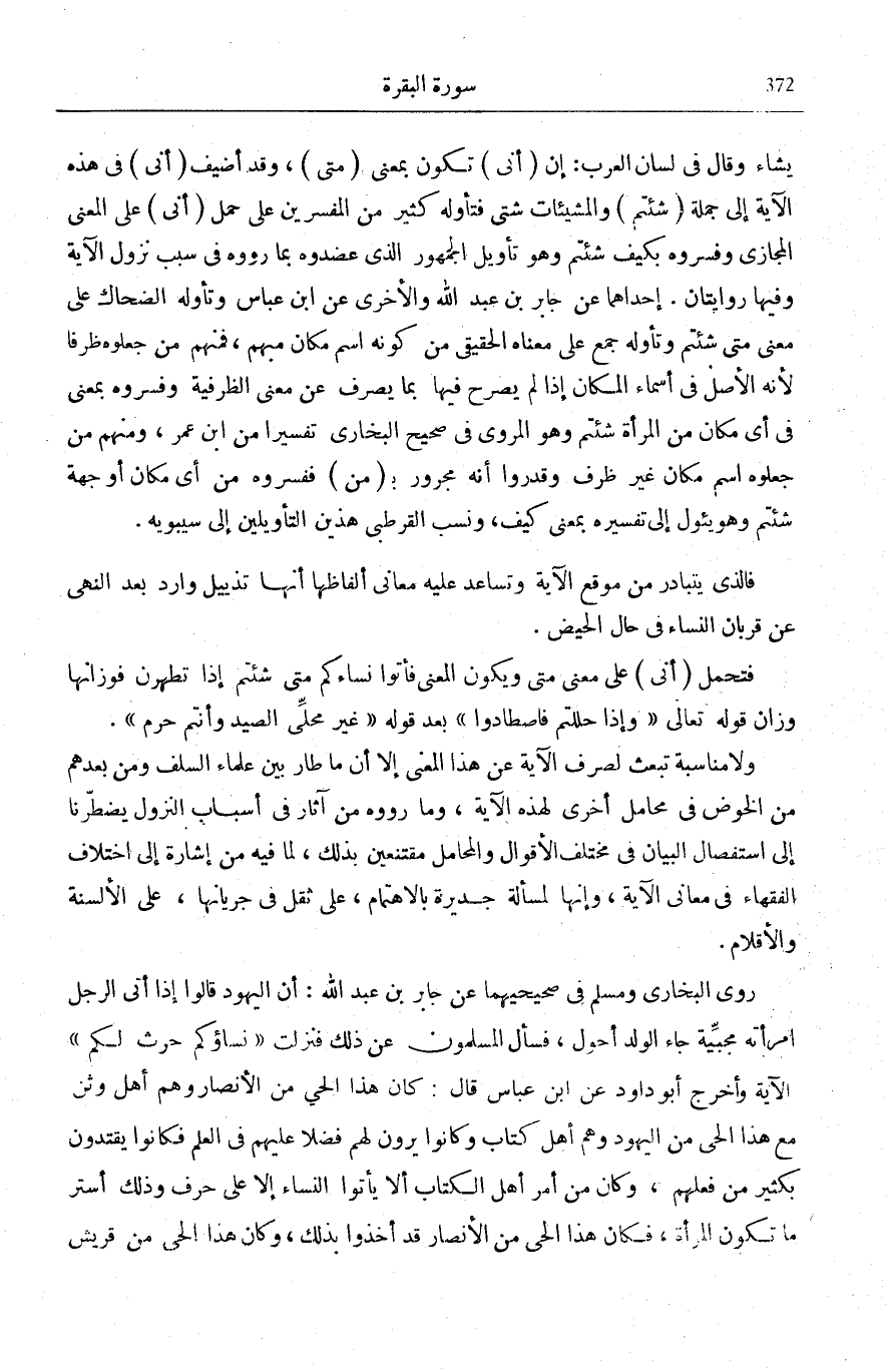 وَالَّذِي أَرَاهُ أَنَّ قَوْلَهُ: مِنْ حَيْثُ أَمَرَكُمُ اللَّهُ قَدْ عَلِمَ السَّامِعُونَ مِنْهُ أَنَّهُ أَمْرٌ مِنَ اللَّهِ كَانَ قَدْ حَصَلَ فِيمَا قَبْلُ، وَأَمَّا (حَيْثُ) فَظَرْفُ مَكَانٍ وَقَدْ تُسْتَعْمَلُ مَجَازًا فِي التَّعْلِيلِ فَيَجُوزُ أَنَّ الْمُرَادَ بِأَمْرِ اللَّهِ أَمْرُهُ الَّذِي تَضَمَّنَتْهُ الْغَايَةُ بِ (حَتَّى) فِي قَوْلِهِ: وَلا تَقْرَبُوهُنَّ حَتَّى يَطْهُرْنَ لِأَنَّ غَايَةَ النَّهْيِ تَنْتَهِي إِلَى الْإِبَاحَةِ فَالْأَمْرُ هُوَ الْإِذْنُ، وَ (مِنْ) لِلِابْتِدَاءِ الْمَجَازِيِّ، وَ (حَيْثُ) مُسْتَعْمَلَةٌ فِي التَّعْلِيلِ مَجَازًا تَخْيِيلِيًّا أَيْ لِأَنَّ اللَّهَ أَمَرَكُمْ بِأَنْ تَأْتُوهُنَّ عِنْدَ انْتِهَاءِ غَايَةِ النَّهْيِ بِالتَّطَهُّرِ. أَوِ الْمُرَادُ بِأَمْرِ اللَّهِ أَمْرُهُ الَّذِي بِهِ أَبَاحَ التَّمَتُّعَ بِالنِّسَاءِ وَهُوَ عَقْدُ النِّكَاحِ، فَحَرْفُ (مِنْ) لِلتَّعْلِيلِ وَالسَّبَبِيَّةِ، وَ (حَيْثُ) مُسْتَعَارٌ لِلْمَكَانِ الْمَجَازِيِّ وَهُوَ حَالَةُ الْإِبَاحَةِ الَّتِي قَبْلَ النَّهْيِ كَأَنَّهُمْ كَانُوا مَحْجُوزِينَ عَنِ اسْتِعْمَالِ الْإِبَاحَةِ أَوْ حُجِرَ عَلَيْهِمُ الِانْتِفَاعُ بِهَا ثُمَّ أُذِنَ لَهُمْ بِاسْتِعْمَالِهَا فَشُبِّهَتْ حَالَتُهُمْ بِحَالَةِ مَنْ حُبِسَ عِنْدَ مَكَانٍ ثُمَّ أُطْلِقَ سَرَاحُهُ فَهُوَ يَأْتِي مِنْهُ إِلَى حَيْثُ يُرِيدُ. وَعَلَى هَذَيْنِ الْمَعْنَيَيْنِ لَا يَكُونُ فِي الْآيَةِ مَا يُؤْذِنُ بِقَصْدِ تَحْدِيدِ الْإِتْيَانِ بِأَنْ يَكُونَ فِي مَكَانِ النَّسْلِ، وَيُعَضِّدُ هَذَيْنِ الْمَعْنَيَيْنِ تَذْيِيلُ الْكَلَامِ بِجُمْلَةِ: إِنَّ اللَّهَ يُحِبُّ التَّوَّابِينَ وَيُحِبُّ الْمُتَطَهِّرِينَ وَهُوَ ارْتِفَاقٌ بِالْمُخَاطَبِينَ بِأَنَّ ذَلِكَ الْمَنْعَ كَانَ لِمَنْفَعَتِهِمْ لِيَكُونُوا مُتَطَهِّرِينَ، وَأَمَّا ذِكْرُ التَّوَّابِينَ فَهُوَ إِدْمَاجٌ لِلتَّنْوِيهِ بِشَأْنِ التَّوْبَةِ عِنْدَ ذِكْرِ مَا يَدُلُّ عَلَى امْتِثَالِ مَا