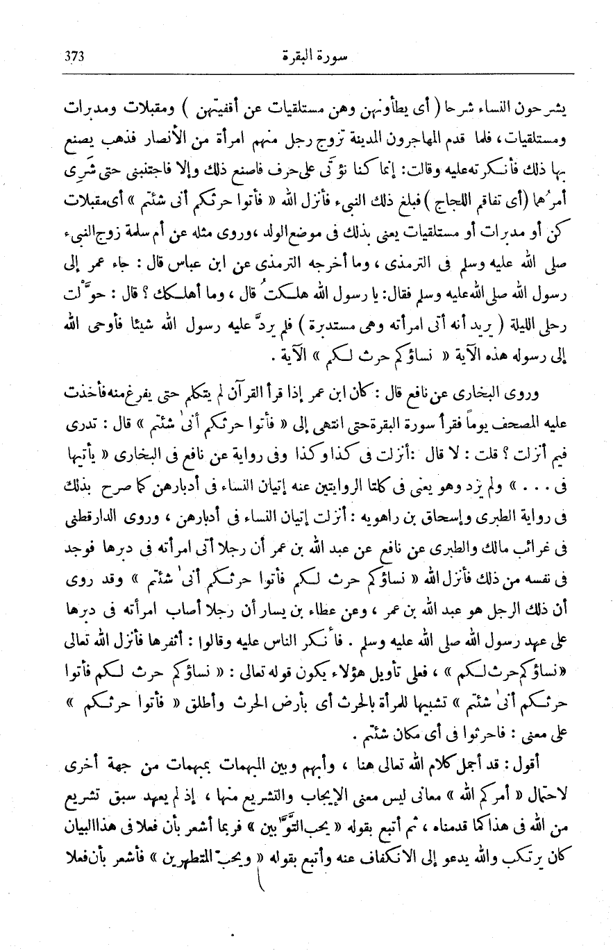 يَعْلَمُ أَنَّ نِسَاءَهُمْ مَحَلُّ تَعَهُّدِهِمْ وَمُلَابَسَتِهِمْ لَيْسَ مَنْعُهُمْ مِنْهُنَّ فِي بَعْضِ الْأَحْوَالِ بِأَمْرٍ هَيِّنٍ عَلَيْهِمْ لَوْلَا إِرَادَةُ حِفْظِهِمْ مِنَ الْأَذَى، كَقَوْلِ عُمَرَ بْنِ الْخَطَّابِ لَمَّا حَمَى الْحِمَى «لَوْلَا الْمَالُ الَّذِي أَحْمِلُ عَلَيْهِ فِي سَبِيلِ اللَّهِ مَا حَمَيْتُ عَلَيْهِمْ مِنْ بِلَادِهِمْ شِبْرًا إِنَّهَا لَبِلَادُهُمْ» وَتُعْتَبَرُ جُمْلَةُ نِساؤُكُمْ حَرْثٌ مُقَدِّمَةً لِجُمْلَةِ فَأْتُوا حَرْثَكُمْ أَنَّى شِئْتُمْ وَفِيهَا مَعْنَى التَّعْلِيلِ لِلْإِذْنِ بِإِتْيَانِهِنَّ أَنَّى شَاءُوا، وَالْعِلَّةُ قَدْ تُجْعَلُ مُقَدِّمَةً فَلَوْ أُوثِرَ مَعْنَى التَّعْلِيلِ لَأُخِّرَتْ عَنْ جُمْلَةِ فَأْتُوا حَرْثَكُمْ أَنَّى شِئْتُمْ وَلَكِنْ أُوثِرَ أَنْ تَكُونَ مُقَدِّمَةً لِلَّتِي بَعْدَهَا لِأَنَّهُ أَحْكَمُ نَسِيجٍ نُظِمَ وَلِتَتَأَتَّى عَقِبَهُ الْفَاءُ الْفَصِيحَةُ.