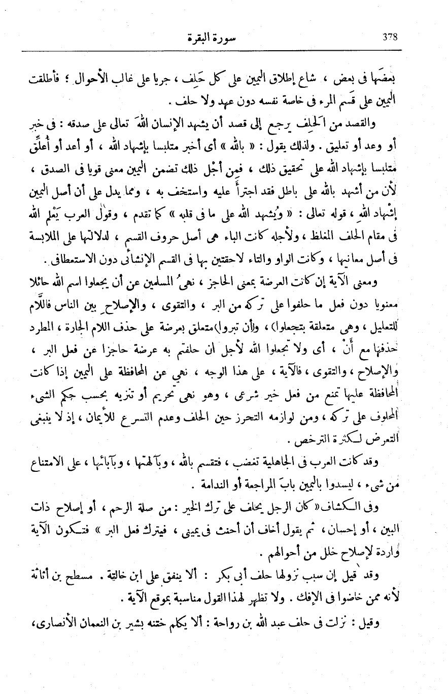 عَنْهَا، وَقَالَ الْوَاحِدِيُّ عَنِ الْكَلْبِيِّ: نَزَلَتْ فِي عَبْدِ اللَّهِ بْنِ رَوَاحَةَ حَلَفَ أَلَّا يُكَلِّمَ خَتَنَهُ عَلَى أُخْتِهِ بَشِيرَ بْنَ النُّعْمَانِ وَلَا يَدْخُلَ بَيْتَهُ وَلَا يُصْلِحَ بَيْنَهُ وَبَيْنَ امْرَأَتِهِ، وَأَيًّا مَا كَانَ فَوَاوُ الْعَطْفِ لَا بُدَّ أَنْ تَرْبُطَ هَذِهِ الْجُمْلَةَ بِشَيْءٍ مِنَ الْكَلَامِ الَّذِي قبلهَا.