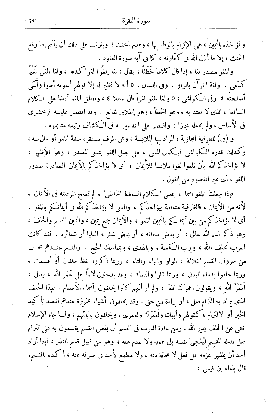 وَفِي مَعْنَى هَذَا أَنْ يَكُونَ الْعُرْضَةُ مُسْتَعَارًا لِمَا يَكْثُرُ الْحُلُولُ حَوْلَهُ، أَيْ لَا تَجْعَلُوا اسْمَ اللَّهِ كَالشَّيْءِ الْمُعَرَّضِ لِلْقَاصِدِينَ. وَلَيْسَ فِي الْآيَةِ عَلَى هَذِهِ الْوُجُوهِ مَا يُفْهِمُ الْإِذْنَ فِي الْحَلِفِ بِغَيْرِ اللَّهِ، لِمَا تَقَرَّرَ مِنَ النَّهْيِ عَنِ الْحَلِفِ بِغَيْرِ اسْمِ اللَّهِ وَصِفَاتِهِ.