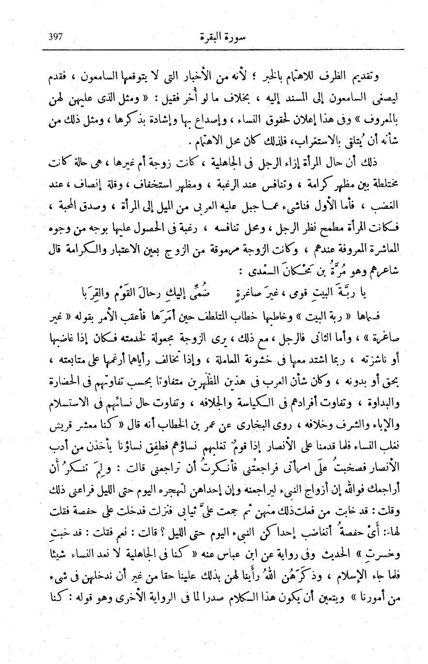 الْآيَةِ، عَلَى أَنَّهَا جَاءَتْ لِتَشْرِيعِ حُكْمِ الْمُرَاجَعَةِ فِي الطَّلَاقِ مَا دَامَتِ الْعِدَّةُ، وَعِنْدِي أَنَّ هَذَا لَيْسَ مُجَرَّدَ تَشْرِيعٍ لِلْمُرَاجَعَةِ بَلِ الْآيَةُ جَامِعَةٌ لِأَمْرَيْنِ: حُكْمِ الْمُرَاجَعَةِ، وَتَحْضِيضِ الْمُطَلِّقِينَ عَلَى مُرَاجَعَةِ الْمُطَلَّقَاتِ، وَذَلِكَ أَنَّ الْمُتَفَارِقَيْنِ لَا بُدَّ أَنْ يَكُونَ لِأَحَدِهِمَا أَوْ لِكِلَيْهِمَا، رَغْبَةٌ فِي الرُّجُوعِ، فَاللَّهُ يُعْلِمُ الرِّجَالَ بِأَنَّهُمْ أَوْلَى بِأَنْ يَرْغَبُوا فِي مُرَاجَعَةِ النِّسَاءِ، وَأَنْ يَصْفَحُوا عَنِ الْأَسْبَابِ الَّتِي أَوْجَبَتِ الطَّلَاقَ لِأَنَّ الرَّجُلَ هُوَ مَظِنَّةُ الْبَصِيرَةِ وَالِاحْتِمَالِ، وَالْمَرْأَةُ أَهْلُ الْغَضَبِ وَالْإِبَاءِ.