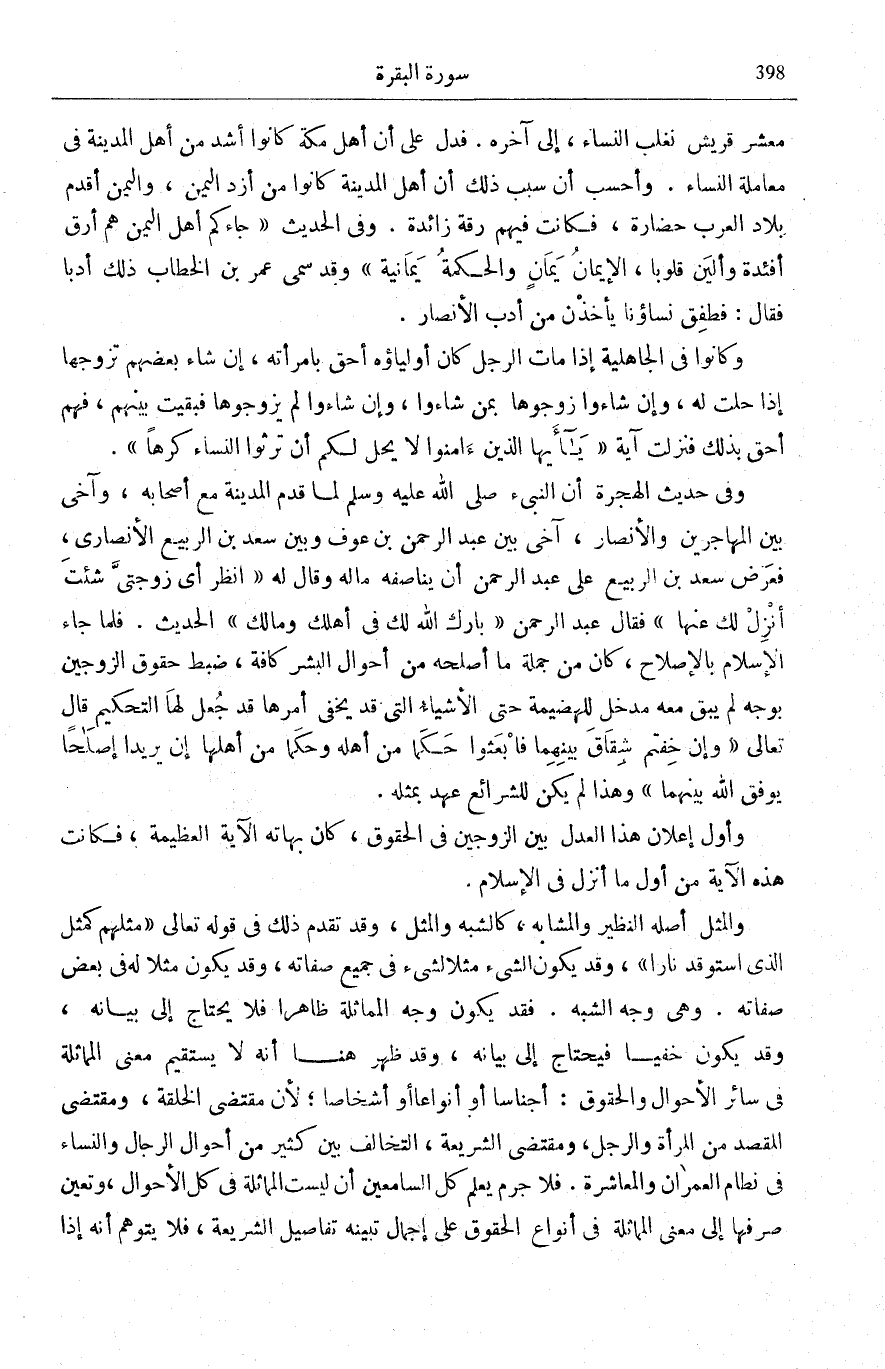 بِتِلْكَ الْمُنَاسَبَةِ، وَلَمَّا اخْتَتَمَ حُكْمَ الطَّلَاقِ بِقَوْلِهِ: وَبُعُولَتُهُنَّ أَحَقُّ بِرَدِّهِنَّ فِي ذلِكَ صَارَ أُولَئِكَ النِّسَاءُ الْمُطَلَّقَاتُ زَوْجَاتٍ، فَعَادَ الضَّمِيرُ إِلَيْهِنَّ بِاعْتِبَارِ هَذَا الْوَصْفِ الْجَدِيدِ، الَّذِي هُوَ الْوَصْفُ الْمُبْتَدَأُ بِهِ فِي الْحُكْمِ، فَكَانَ فِي الْآيَةِ ضَرْبٌ مِنْ رَدِّ الْعَجُزِ عَلَى الصَّدْرِ، فَعَادَتْ إِلَى أَحْكَامِ الزَّوْجَاتِ بِأُسْلُوبٍ عَجِيبٍ وَالْمُنَاسَبَةُ أَنَّ فِي الْإِيلَاءِ مِنَ النِّسَاءِ تَطَاوُلًا عَلَيْهِنَّ، وَتَظَاهُرًا بِمَا جَعَلَ اللَّهُ لِلزَّوْجِ مِنْ حَقِّ التَّصَرُّفِ فِي الْعِصْمَةِ، فَنَاسَبَ أَنْ يُذَكَّرُوا بِأَنَّ لِلنِّسَاءِ مِنَ الْحَقِّ مِثْلَ مَا لِلرِّجَالِ.