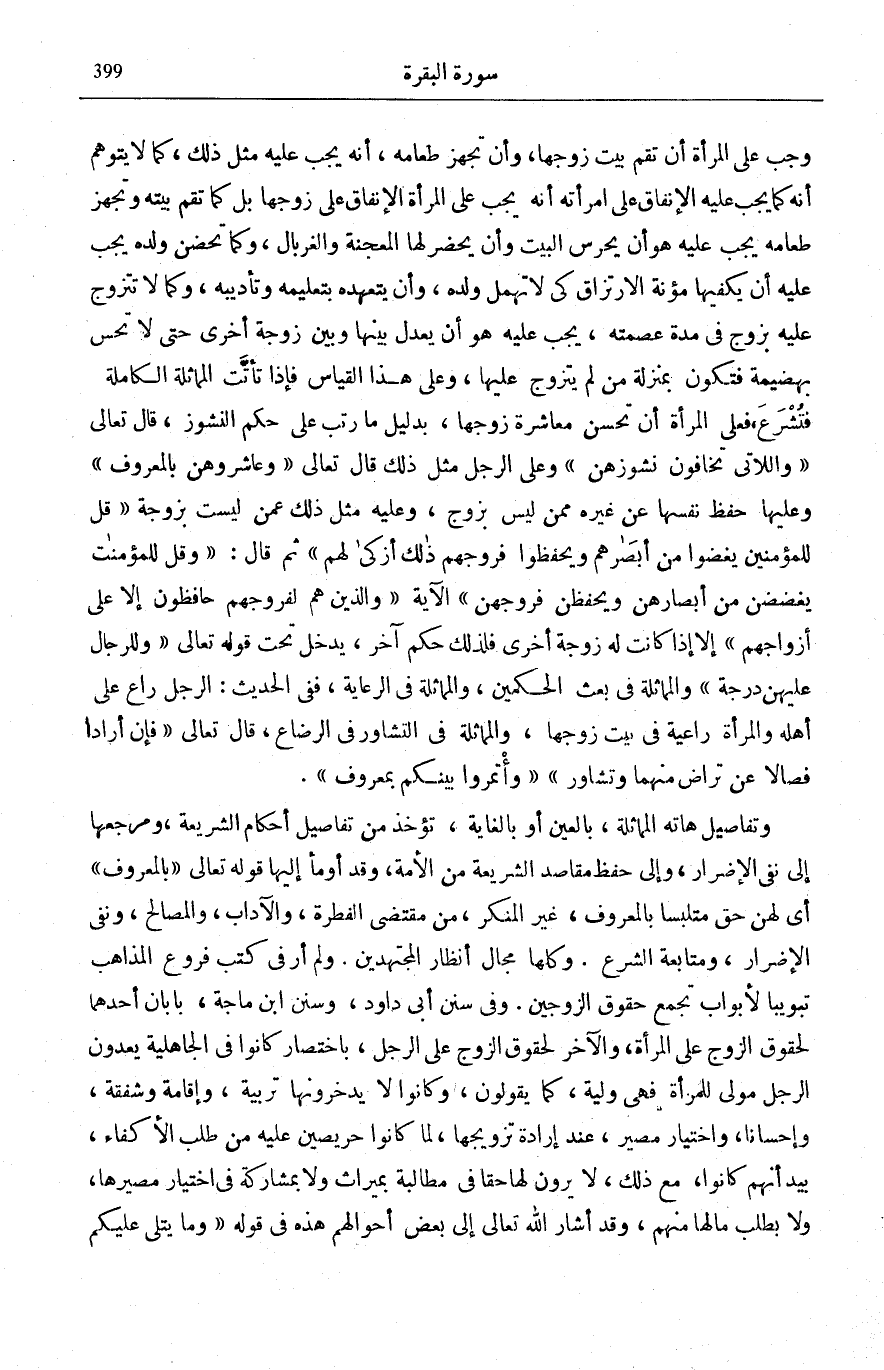 وَتَقْدِيمُ الظَّرْفِ لِلِاهْتِمَامِ بِالْخَبَرِ لِأَنَّهُ مِنَ الْأَخْبَارِ الَّتِي لَا يَتَوَقَّعُهَا السَّامِعُونَ، فَقُدِّمَ لِيُصْغِيَ السَّامِعُونَ إِلَى الْمُسْنَدِ إِلَيْهِ، بِخِلَافِ مَا لَوْ أُخِّرَ فَقِيلَ: وَمِثْلُ الَّذِي عَلَيْهِنَّ لَهُنَّ بِالْمَعْرُوفِ، وَفِي هَذَا إِعْلَانٌ لِحُقُوقِ النِّسَاءِ، وَإِصْدَاعٌ بِهَا وَإِشَادَةٌ بِذِكْرِهَا، وَمِثْلُ ذَلِكَ مِنْ شَأْنِهِ أَنْ يُتَلَقَّى بِالِاسْتِغْرَابِ، فَلِذَلِكَ كَانَ مَحَلَّ الِاهْتِمَامِ. ذَلِكَ أَنَّ حَالَ الْمَرْأَةِ إِزَاءَ الرَّجُلِ فِي الْجَاهِلِيَّةِ، كَانْتُ زَوْجَةً أَمْ غَيْرَهَا، هِيَ حَالَةٌ كَانَتْ مُخْتَلِطَةً بَيْنَ مَظْهَرِ كَرَامَةٍ وَتَنَافُسٍ عِنْدَ الرَّغْبَةِ، وَمَظْهَرِ اسْتِخْفَافٍ وَقِلَّةِ إِنْصَافٍ، عِنْدَ الْغَضَبِ، فَأَمَّا الْأَوَّلُ فَنَاشِئٌ عَمَّا جُبِلَ عَلَيْهِ الْعَرَبِيُّ مِنَ الْمَيْلِ إِلَى الْمَرْأَةِ وَصِدْقِ الْمَحَبَّةِ، فَكَانَتِ الْمَرْأَةُ مَطْمَحَ نَظَرِ الرَّجُلِ، وَمَحَلَّ تَنَافُسِهِ، رَغْبَةً فِي الْحُصُولِ عَلَيْهَا بِوَجْهٍ مِنْ وُجُوهِ الْمُعَاشَرَةِ الْمَعْرُوفَةِ عِنْدَهُمْ، وَكَانَتِ الزَّوْجَةُ مَرْمُوقَةً مِنَ الزَّوْجِ بِعَيْنِ الِاعْتِبَارِ وَالْكَرَامَةِ قَالَ شَاعِرُهُمْ وَهُوَ مُرَّةُ بْنُ مَحْكَانَ السَّعْدِيُّ: