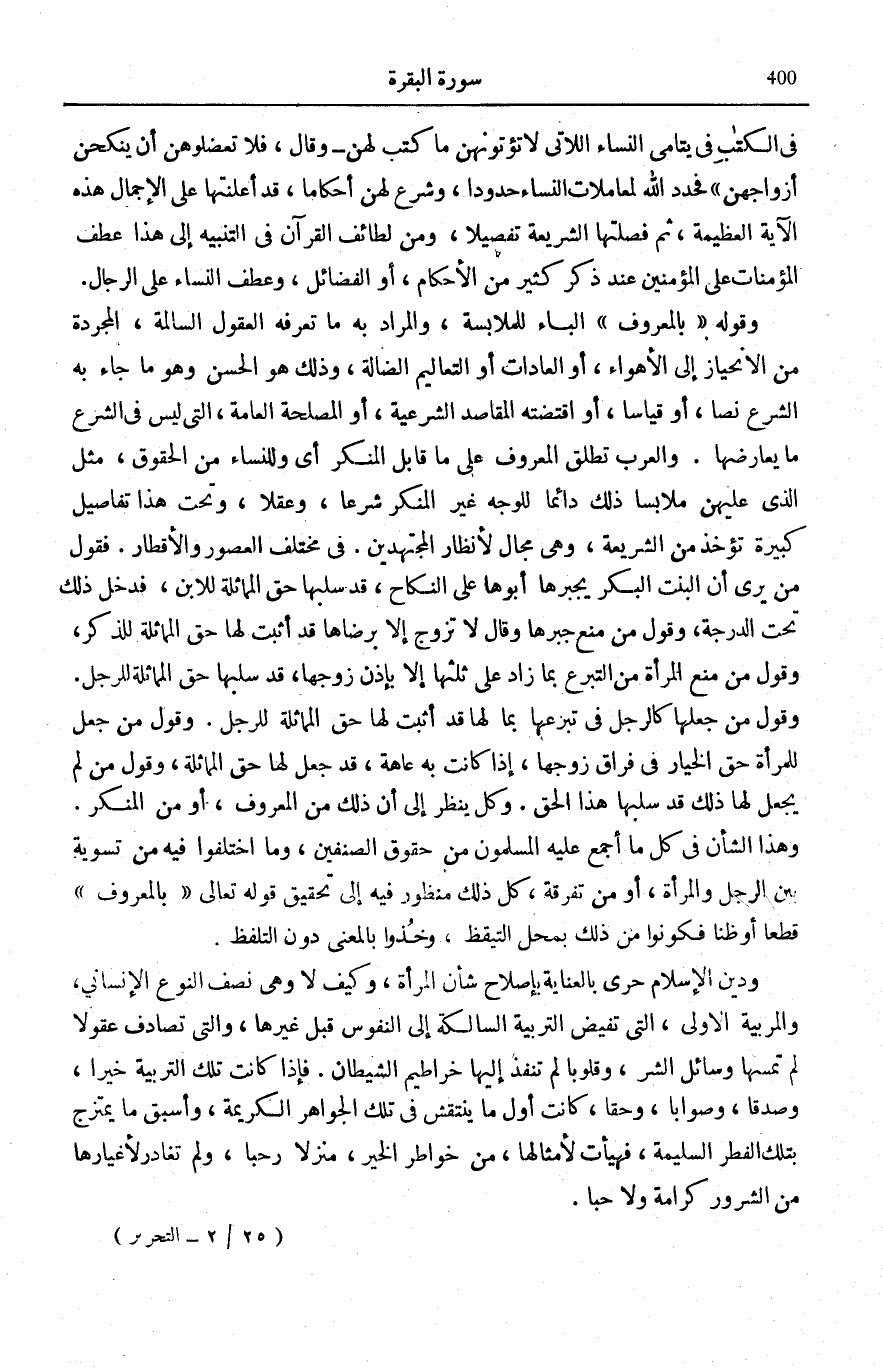 مَثَلُهُمْ كَمَثَلِ الَّذِي اسْتَوْقَدَ نَارا [الْبَقَرَة: 17] ، وَقَدْ يَكُونُ الشَّيْءُ مَثَلًا لِشَيْءٍ فِي جَمِيعِ صِفَاتِهِ وَقَدْ يَكُونُ مَثَلًا لَهُ فِي بَعْضِ صِفَاتِهِ. وَهِيَ وَجْهُ الشَّبَهِ. فَقَدْ يَكُونُ وَجْهُ الْمُمَاثَلَةِ ظَاهِرًا فَلَا يُحْتَاجُ إِلَى بَيَانِهِ، وَقَدْ يَكُونُ خَفِيًّا فَيُحْتَاجُ إِلَى بَيَانِهِ، وَقَدْ ظَهَرَ هُنَا أَنَّهُ لَا يَسْتَقِيمُ مَعْنَى الْمُمَاثَلَةِ فِي سَائِرِ الْأَحْوَالِ وَالْحُقُوقِ: أَجْنَاسًا أَوْ أَنْوَاعًا أَوْ أَشْخَاصًا لِأَنَّ مُقْتَضَى الْخِلْقَةِ، وَمُقْتَضَى الْمَقْصِدِ مِنَ الْمَرْأَةِ وَالرَّجُلِ، وَمُقْتَضَى الشَّرِيعَةِ، التَّخَالُفُ بَيْنَ كَثِيرٍ مِنْ أَحْوَالِ الرِّجَالِ وَالنِّسَاءِ فِي نِظَامِ الْعُمْرَانِ وَالْمُعَاشَرَةِ. فَلَا جَرَمَ يَعْلَمُ كُلُّ السَّامِعِينَ أَنْ لَيْسَتِ الْمُمَاثَلَةُ فِي كُلِّ الْأَحْوَالِ، وَتَعَيَّنَ صَرْفُهَا إِلَى مَعْنَى الْمُمَاثِلَةِ فِي أَنْوَاعِ الْحُقُوقِ عَلَى إِجْمَالٍ تُبَيِّنُهُ تَفَاصِيلُ الشَّرِيعَةِ، فَلَا يُتَوَهَّمُ أَنَّهُ إِذَا