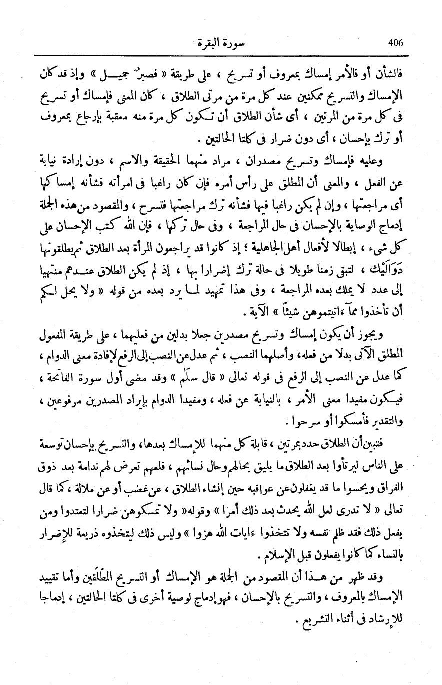 [الْبَقَرَة: 275] وَقَوْلِهِ: وَإِنْ عَزَمُوا الطَّلاقَ [الْبَقَرَة: 227] وَهَذَا التَّعْرِيفُ هُوَ الَّذِي أَشَارَ صَاحِبُ «الْكَشَّافِ» إِلَى اخْتِيَارِهِ، فَالْمَقْصُودُ هُنَا الطَّلَاقُ الرَّجْعِيُّ الَّذِي سَبَقَ الْكَلَامُ عَلَيْهِ آنِفًا فِي قَوْلِهِ: وَبُعُولَتُهُنَّ أَحَقُّ بِرَدِّهِنَّ فِي ذلِكَ [الْبَقَرَة: 228] فَإِنَّهُ الطَّلَاقُ الْأَصْلِيُّ، وَلَيْسَ فِي أَصْلِ الشَّرِيعَةِ طَلَاقٌ بَائِنٌ غَيْرُ قَابِلٍ لِلْمُرَاجَعَةِ لِذَاتِهِ، إِلَّا الطَّلْقَةُ الْوَاقِعَةُ ثَالِثَةً، بَعْدَ سَبْقِ طَلْقَتَيْنِ قَبْلَهَا فَإِنَّهَا مُبِينَةٌ بَعْدُ وَأَمَّا مَا عَدَاهَا مِنَ الطَّلَاقِ الْبَائِنِ الثَّابِتِ بِالسَّنَةِ، فَبَيْنُونَتُهُ لِحَقٍّ عَارِضٍ كَحَقِّ الزَّوْجَةِ فِيمَا تُعْطِيهِ مِنْ مَالِهَا فِي الْخُلْعِ، وَمِثْلِ الْحَقِّ الشَّرْعِيِّ فِي تَطْلِيقِ اللِّعَانِ، لِمَظِنَّةِ انْتِفَاءِ حُسْنِ الْمُعَاشَرَةِ بَعْدَ أَنْ تَلَاعَنَا، وَمِثْلِ حَقِّ الْمَرْأَةِ فِي حُكْمِ الْحَاكِمِ لَهَا بِالطَّلَاقِ لِلْإِضْرَارِ بِهَا، وَحَذَفَ وَصْفَ الطَّلَاقِ، لِأَنَّ السِّيَاقَ دَالٌّ عَلَيْهِ، فَصَارَ التَّقْدِيرُ: