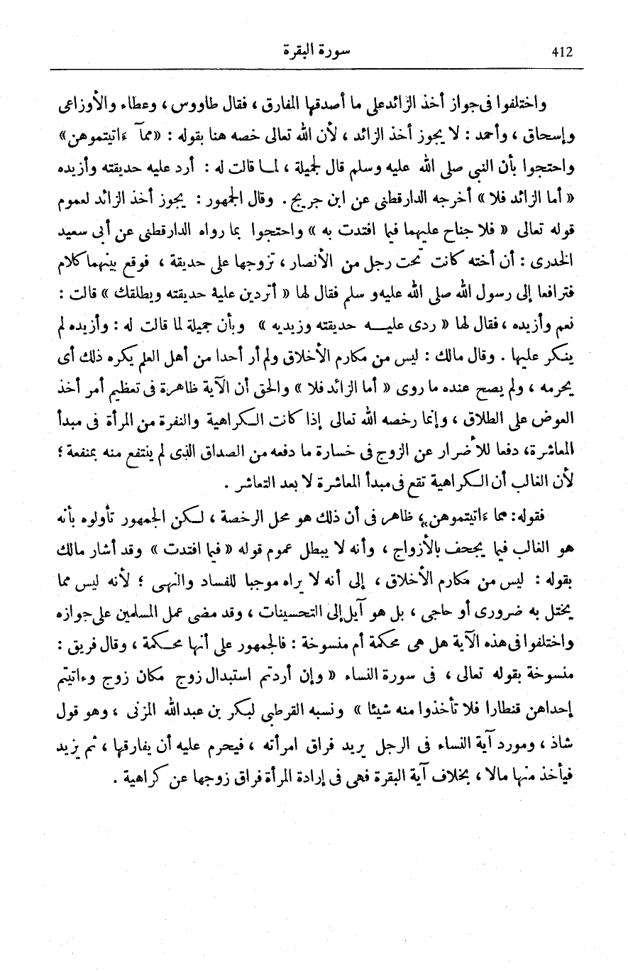 وَلَمْ يَخْتَلِفْ عُلَمَاءُ الْأُمَّةِ أَنَّ الْمُرَادَ بِالْآيَةِ أَخْذُ الْعِوَضِ عَلَى الْفِرَاقِ، وَإِنَّمَا اخْتَلَفُوا فِي هَذَا الْفِرَاقِ هَلْ هُوَ طَلَاقٌ أَوْ فَسْخٌ؟ فَذَهَبَ الْجُمْهُورُ إِلَى أَنَّهُ طَلَاقٌ وَلَا يَكُونُ إِلَّا بَائِنًا إِذْ لَوْ لَمْ يَكُنْ بَائِنًا لَمَا ظَهَرَتِ الْفَائِدَةُ فِي بَذْلِ الْعِوَضِ، وَبِهِ قَالَ عُثْمَانُ وَعَلِيٌّ وَابْنُ مَسْعُودٍ وَالْحَسَنُ وَعَطَاءٌ وَابْنُ الْمُسَيَّبِ وَالزُّهْرِيُّ وَمَالِكٌ وَأَبُو حَنِيفَةَ وَالثَّوْرِيُّ وَالْأَوْزَاعِيُّ وَالشَّعْبِيُّ وَالنَّخَعِيُّ وَمُجَاهِدٌ وَمَكْحُولٌ.