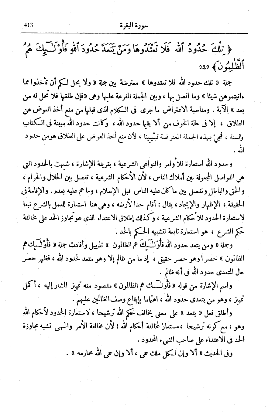 بِنَاءً عَلَى أَصْلِهِ فِي النَّهْيِ، إِذا كَانَ لخارج عَنْ مَاهِيَّةِ الْمَنْهِيِّ عَنْهُ. وَقَالَ الزُّهْرِيُّ وَالنَّخَعِيُّ وَدَاوُدُ: لَا يَجُوزُ إِلَّا عِنْدَ النُّشُوزِ وَالشِّقَاقِ. وَالْحَقُّ أَنَّ الْآيَةَ صَرِيحَةٌ فِي تَحْرِيمِ أَخْذِ الْعِوَضِ عَنِ الطَّلَاقِ إِلَّا إِذَا خِيفَ فَسَادُ الْمُعَاشَرَةِ بِأَلَّا تُحِبَّ الْمَرْأَةُ زَوْجَهَا، فَإِنَّ اللَّهَ أَكَّدَ هَذَا الْحُكْمَ إِذْ قَالَ: إِلَّا أَنْ يَخافا أَلَّا يُقِيما حُدُودَ اللَّهِ لِأَنَّ مَفْهُومَ الِاسْتِثْنَاءِ قَرِيبٌ مِنَ الصَّرِيحِ فِي أَنَّهُمَا إِنْ لَمْ يَخَافَا ذَلِكَ لَا يَحِلُّ الْخُلْعُ، وَأَكَّدَهُ بِقَوْلِهِ: فَإِنْ خِفْتُمْ أَلَّا يُقِيما حُدُودَ اللَّهِ فَلا جُناحَ عَلَيْهِما فِيمَا افْتَدَتْ بِهِ فَإِنَّ مَفْهُومَهُ أَنَّهُمَا إِنْ لَمْ يَخَافَا ذَلِكَ ثَبَتَ الْجُنَاحُ، ثُمَّ أَكَّدَ ذَلِكَ كُلَّهُ بِالنَّهْيِ بِقَوْلِهِ: تِلْكَ حُدُودُ اللَّهِ فَلا تَعْتَدُوها ثُمَّ بِالْوَعِيدِ بِقَوْلِهِ: وَمَنْ يَتَعَدَّ حُدُودَ اللَّهِ فَأُولئِكَ هُمُ الظَّالِمُونَ وَقَدْ بَيَّنَ ذَلِكَ كُلَّهُ قَضَاءُ رَسُولِ اللَّهِ صَلَّى اللهُ عَلَيْهِ وَسَلَّمَ بَيْنَ جَمِيلَةَ بِنْتِ أَوْ أُخْتِ عَبْدِ اللَّهِ بْنِ أُبَيِّ بن سَلُولَ، وَبَيْنَ زَوْجِهَا ثَابِتِ بْنِ قَيْسِ بْنِ شَمَّاسٍ إِذْ قَالَتْ لَهُ يَا رَسُولَ اللَّهِ لَا أَنَا وَلَا ثَابِتٌ، أَوْ لَا يَجْمَعُ رَأْسِي وَرَأْسُ ثَابِتٍ شَيْءٌ، وَاللَّهِ مَا أَعْتِبُ عَلَيْهِ فِي دِينٍ وَلَا خُلُقٍ وَلَكِنِّي أَكْرَهُ الْكُفْرَ فِي الْإِسْلَامِ لَا أُطِيقُهُ بُغْضًا