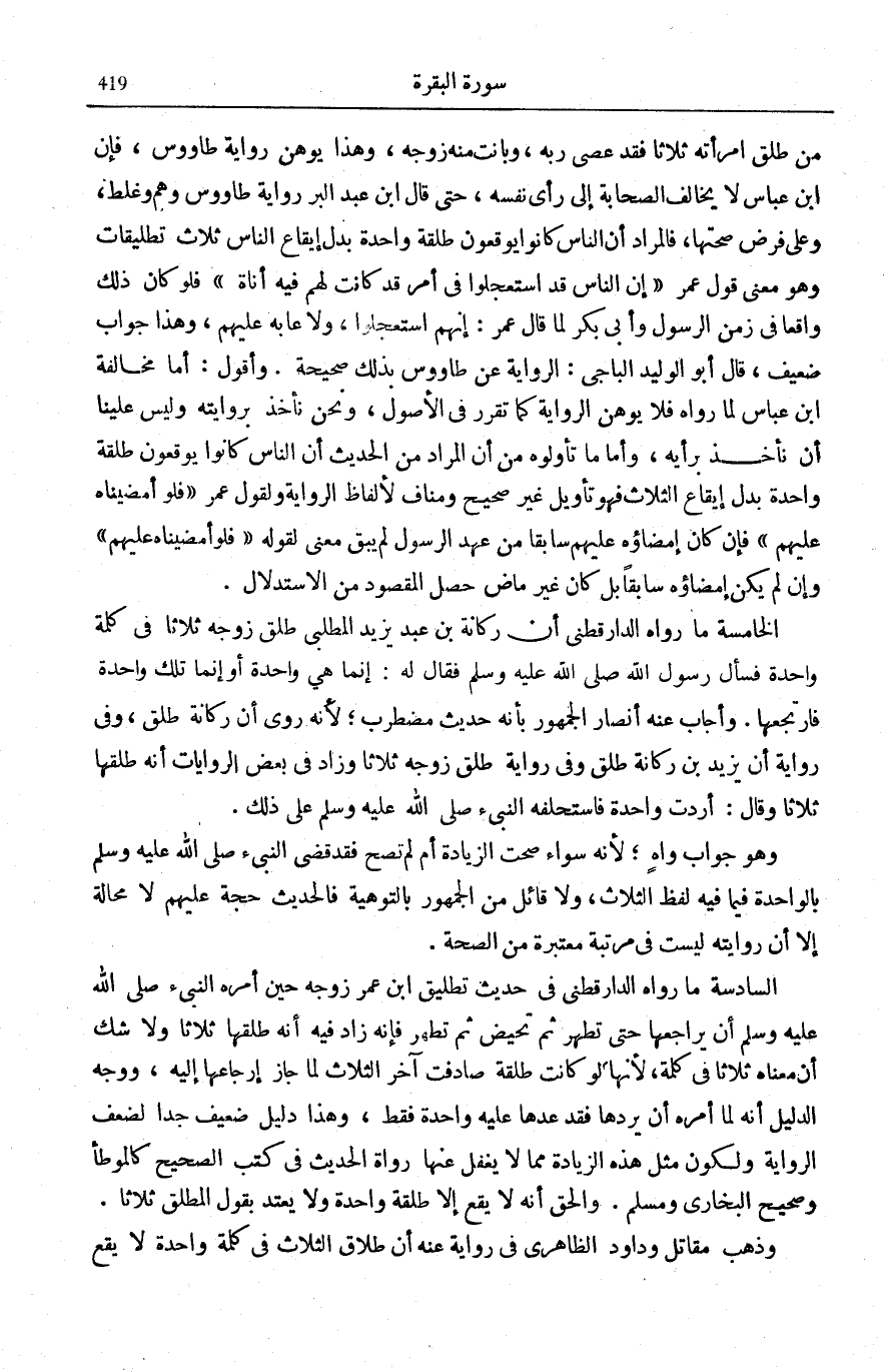 الْحُكْمَ مَنُوطًا بِالْعَقْدِ، بِاعْتِبَارِ مَا يَحْصُلُ بَعْدَهُ غَالِبًا، فَإِذَا تَخَلَّفَ مَا يَحْصُلُ بَعْدَهُ اغْتُفِرَ، مِنْ بَابِ التَّعْلِيلِ بِالْمَظِنَّةِ، وَلَمْ يُتَابِعْهُ عَلَيْهِ أَحَدٌ مَعْرُوفٌ، وَنَسَبَهُ النَّحَّاسُ لِسَعِيدِ بْنِ جُبَيْرٍ، وَأَحْسَبُ ذَلِكَ سَهْوًا مِنْهُ وَاشْتِبَاهًا، وَقَدْ أَمَرَ اللَّهُ بِهَذَا الْحُكْمِ، مُرَتَّبًا عَلَى حُصُولِ الطَّلَاقِ الثَّالِثِ بَعْدَ طَلْقَتَيْنِ تَقَدَّمَتَاهُ فَوَجَبَ امْتِثَالُهُ وَعُلِمَتْ حِكْمَتُهُ فَلَا شَكَّ فِي أَنْ يَقْتَصِرَ بِهِ عَلَى مَوْرِدِهِ، وَلَا يَتَعَدَّى حُكْمُهُ ذَلِكَ إِلَى كُلِّ طَلَاقٍ عَبَّرَ فِيهِ الْمُطَلِّقُ بِلَفْظِ الثَّلَاثِ تَغْلِيظًا، أَوْ تَأْكِيدًا، أَوْ كَذِبًا لِأَنَّ ذَلِكَ لَيْسَ طَلَاقًا بَعْدَ طَلَّاقَيْنِ، وَلَا تَتَحَقَّقُ فِيهِ حِكْمَةُ التَّأْدِيبِ عَلَى سُوءِ الصَّنِيعِ، وَمَا الْمُتَلَفِّظُ بِالثَّلَاثِ فِي طَلَاقِهِ الْأَوَّلِ إِلَّا كَغَيْرِ الْمُتَلَفِّظِ بِهَا فِي كَوْنِ طَلْقَتِهِ الْأُولَى، لَا تَصِيرُ ثَانِيَةً، وَغَايَةُ مَا اكْتَسَبَهُ مَقَالُهُ أَنَّهُ عُدَّ فِي الْحَمْقَى أَوِ الْكَذَّابِينَ، فَلَا يُعَاقَبُ عَلَى ذَلِكَ بِالتَّفْرِيقِ بَيْنَهُ وَبَيْنَ زَوْجِهِ، وَعَلَى هَذَا الْحُكْمِ اسْتَمَرَّ الْعَمَلُ فِي حَيَاةِ رَسُولِ اللَّهِ صَلَّى اللهُ عَلَيْهِ وَسَلَّمَ، وَأَبِي بَكْرٍ، وَصَدْرٍ مِنْ خِلَافَةِ عُمَرَ، كَمَا وَرَدَ فِي كُتُبِ الصَّحِيحِ: «الْمُوَطَّأِ» وَمَا بَعْدَهُ، عَنِ ابْنِ عَبَّاسٍ رَضِيَ اللَّهُ عَنْهُ، وَقَدْ وَرَدَ فِي بَعْضِ الْآثَارِ رِوَايَةُ حَدِيثِ ابْنِ عُمَرَ حِينَ طَلَّقَ امْرَأَتَهُ فِي الْحَيْضِ أَنَّهُ طَلَّقَهَا ثَلَاثًا فِي كَلِمَةٍ،