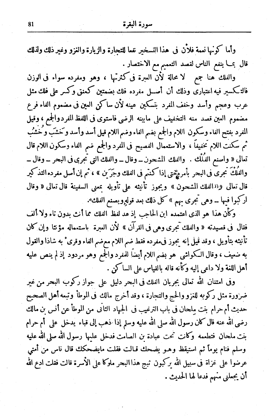 وَالْفُلْكُ هُنَا جَمْعٌ لَا مَحَالَةَ لِأَنَّ الْعِبْرَةَ فِي كَثْرَتِهَا، وَهُوَ وَمُفْرَدُهُ سَوَاءٌ فِي الْوَزْنِ فَالتَّكْسِيرُ فِيهِ اعْتِبَارِيٌّ وَذَلِكَ أَنَّ أَصْلَ مُفْرَدِهِ فُلُكٌ بِضَمَّتَيْنِ كَعُنُقٍ وَكُسِّرَ عَلَى فُلْكٍ مِثْلَ عُرْبٍ وَعُجْمٍ وَأُسْدٍ وَخُفِّفَ الْمُفْرَدُ بِتَسْكِينِ عَيْنِهِ لِأَنَّ سَاكِنَ الْعَيْنِ فِي مَضْمُومِ الْفَاءِ فَرْعُ مَضْمُومِ الْعين مَا قُصِدَ مِنْهُ التَّخْفِيف على مت بَيَّنَهُ الرَّضِيُّ فَاسْتَوَى فِي اللَّفْظِ الْمُفْرَدُ وَالْجَمْعُ، وَقِيلَ الْمُفْرَدُ بِفَتْحِ الْفَاءِ وَسُكُونِ اللَّامِ وَالْجَمْعُ بِضَمِّ الْفَاءِ وَضَمِّ اللَّامِ قِيلَ أَسْدٌ وَأُسُدٌ وَخَشْبٌ وَخُشُبٌ ثُمَّ سُكِّنَتِ اللَّامُ تَخْفِيفًا، وَالِاسْتِعْمَالُ الْفَصِيحُ فِي الْمُفْرَدِ وَالْجَمْعِ ضَمُّ الْفَاءِ