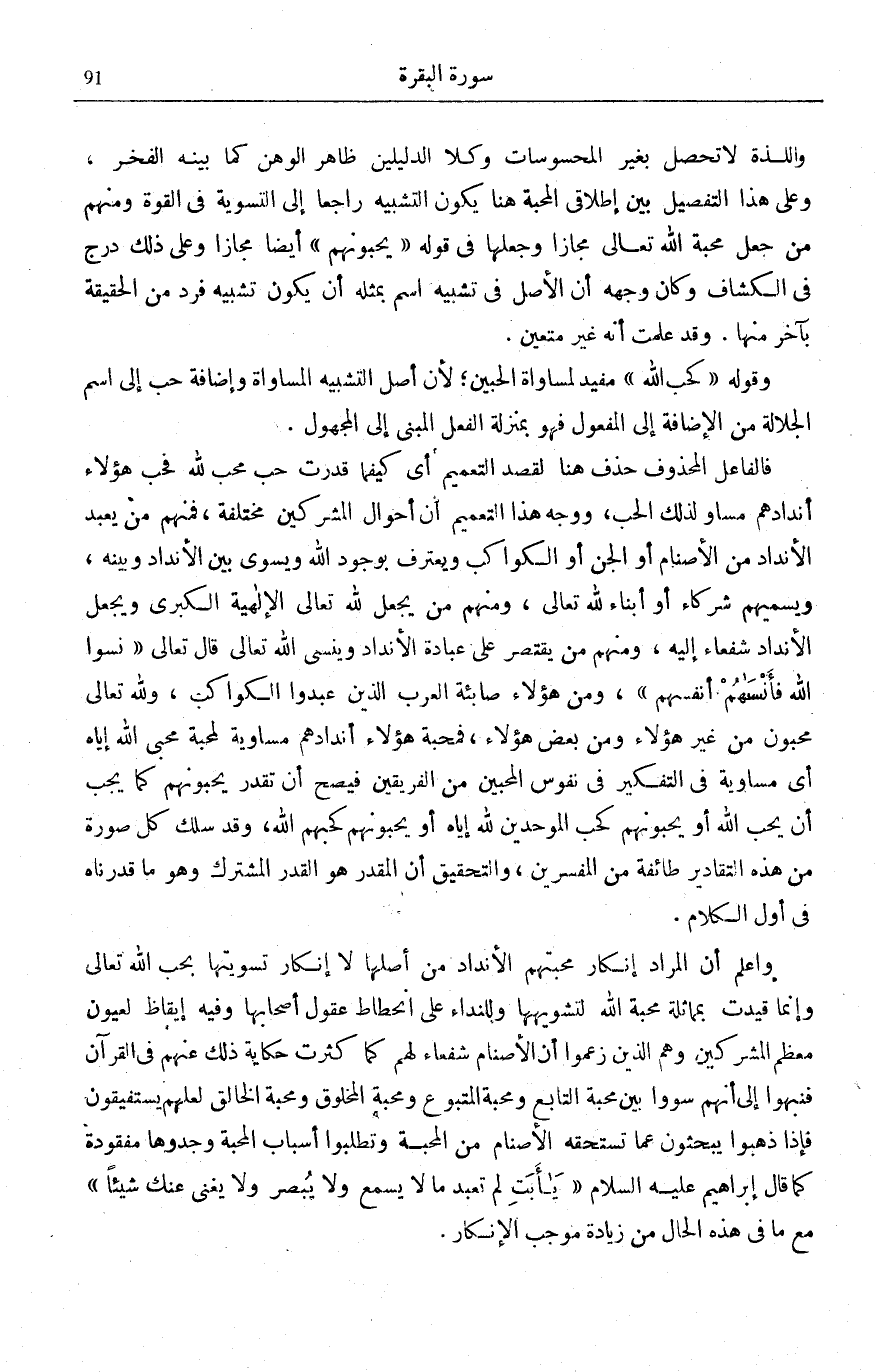 وَاللَّذَّةُ لَا تَحْصُلُ بِغَيْرِ الْمَحْسُوسَاتِ وَكِلَا الدَّلِيلَيْنِ ظَاهِرُ الْوَهَنِ كَمَا بَيَّنَهُ الْفَخْرُ، وعَلى هَذَا التَّفْصِيل بَين إطلاقي الْمَحَبَّةِ هُنَا يَكُونُ التَّشْبِيهُ رَاجِعًا إِلَى التَّسْوِيَةِ فِي الْقُوَّةِ وَمِنْهُمْ مَنْ جَعَلَ مَحَبَّةَ اللَّهِ تَعَالَى مَجَازًا وَجَعَلَهَا فِي قَوْلِهِ: يُحِبُّونَهُمْ أَيْضًا مَجَازًا وَعَلَى ذَلِكَ دُرِجَ فِي «الْكَشَّافِ» وَكَانَ وَجْهُهُ أَنَّ الْأَصْلَ فِي تَشْبِيهِ اسْمٍ بِمِثْلِهِ أَنْ يَكُونَ تَشْبِيهَ فَرْدٍ مِنَ الْحَقِيقَةِ بِآخَرَ مِنْهَا. وَقَدْ عَلِمْتَ أَنَّهُ غَيْرُ مُتَعَيَّنٍ. وَقَوْلُهُ: كَحُبِّ اللَّهِ مُفِيدٌ لِمُسَاوَاةِ الْحُبَّيْنِ لِأَنَّ أَصْلَ التَّشْبِيهِ الْمُسَاوَاةُ وَإِضَافَةُ حُبٍّ إِلَى اسْمِ الْجَلَالَةِ مِنَ الْإِضَافَةِ إِلَى الْمَفْعُولِ فَهُوَ بِمَنْزِلَةِ الْفِعْلِ الْمَبْنِيِّ إِلَى الْمَجْهُولِ. فَالْفَاعِلُ الْمَحْذُوفُ حُذِفَ هُنَا لِقَصْدِ التَّعْمِيمِ أَيْ كَيْفَمَا قَدَّرْتَ حُبَّ مُحِبٍّ لِلَّهِ فَحُبُّ هَؤُلَاءِ أَنْدَادَهُمْ مُسَاوٍ لِذَلِكَ الْحُبِّ، وَوَجْهُ هَذَا التَّعْمِيمِ أَنَّ أَحْوَالَ الْمُشْرِكِينَ مُخْتَلِفَةٌ، فَمِنْهُمْ مَنْ يَعْبُدُ الْأَنْدَادَ مِنَ الْأَصْنَامِ أَوِ الْجِنَّ أَوِ الْكَوَاكِبِ وَيَعْتَرِفُ بِوُجُودِ اللَّهِ وَيُسَوِّي بَيْنَ الْأَنْدَادِ وَبَيْنَهُ، وَيُسَمِّيهِمْ شُرَكَاءَ أَو أَبنَاء الله تَعَالَى، وَمِنْهُمْ مَنْ يَجْعَلُ لِلَّهِ تَعَالَى الْإِلَهِيَّةَ الْكُبْرَى وَيَجْعَلُ الْأَنْدَادَ شُفَعَاءَ إِلَيْهِ، وَمِنْهُمْ مَنْ يَقْتَصِرُ عَلَى عِبَادَةِ الْأَنْدَادِ وَيَنْسَى اللَّهَ تَعَالَى قَالَ تَعَالَى: نَسُوا اللَّهَ فَأَنْساهُمْ أَنْفُسَهُمْ [الْحَشْر: 19] ، وَمِنْ هَؤُلَاءِ صَابِئَةُ الْعَرَبِ الَّذِينَ عَبَدُوا الْكَوَاكِبَ، وَلِلَّهِ تَعَالَى مُحِبُّونَ مِنْ غَيْرِ هَؤُلَاءِ وَمِنْ بَعْضِ هَؤُلَاءِ، فَمَحَبَّةُ هَؤُلَاءِ أَنْدَادَهُمْ مُسَاوِيَةٌ لِمَحَبَّةِ مُحِبِّي اللَّهِ إِيَّاهُ أَيْ مُسَاوِيَةٌ فِي التَّفْكِيرِ فِي نُفُوسِ الْمُحِبِّينَ مِنَ الْفَرِيقَيْنِ فَيَصِحُّ أَنْ تُقَدِّرَ يُحِبُّونَهُمْ كَمَا يحب أَنْ يُحَبَّ اللَّهُ أَوْ يُحِبُّونَهُمْ كَحُبِّ الْمُوَحِّدِينَ لِلَّهِ إِيَّاهُ أَوْ يُحِبُّونَهُمْ كَحُبِّهِمُ اللَّهَ، وَقَدْ سَلَكَ كُلَّ صُورَةٍ مِنْ هَذِهِ التَّقَادِيرِ طَائِفَةٌ مِنَ الْمُفَسِّرِينَ، وَالتَّحْقِيقُ أَنَّ الْمُقَدَّرَ هُوَ الْقَدْرُ الْمُشْتَرَكُ وَهُوَ مَا قَدَّرْنَاهُ فِي أَوَّلِ الْكَلَامِ.