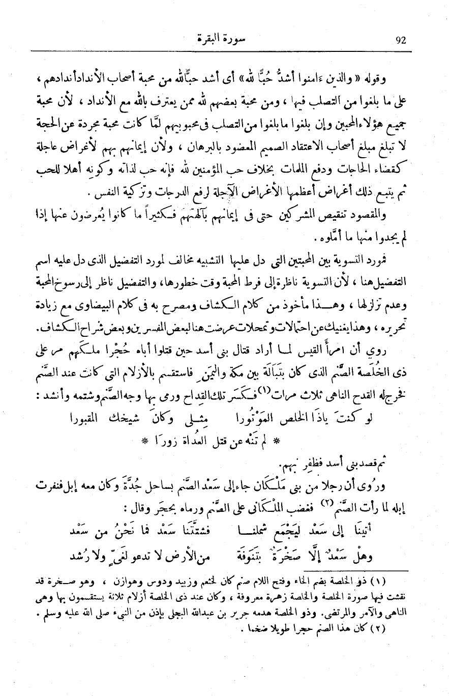 وَالْمَقْصُودُ تَنْقِيصُ الْمُشْرِكِينَ حَتَّى فِي إِيمَانِهِمْ بِآلِهَتِهِمْ فَكَثِيرًا مَا كَانُوا يُعْرِضُونَ عَنْهَا إِذَا لَمْ يَجِدُوا مِنْهَا مَا أَمَّلُوهُ. فَمَوْرِدُ التَّسْوِيَةِ بَيْنَ الْمَحَبَّتَيْنِ الَّتِي دَلَّ عَلَيْهَا التَّشْبِيهُ مُخَالِفٌ لِمَوْرِدِ التَّفْضِيلِ الَّذِي دَلَّ عَلَيْهِ اسْمُ التَّفْضِيلِ هُنَا، لِأَنَّ التَّسْوِيَةَ نَاظِرَةٌ إِلَى فَرْطِ الْمَحَبَّةِ وَقْتَ خُطُورِهَا، وَالتَّفْضِيلُ نَاظِرٌ إِلَى رُسُوخِ الْمحبَّة وَعدم تزلزلها، وَهَذَا مَأْخُوذٌ مِنْ كَلَامِ «الْكَشَّافِ» وَمُصَرَّحٌ بِهِ فِي كَلَامِ الْبَيْضَاوِيِّ مَعَ زِيَادَةِ تَحْرِيرِهِ، وَهَذَا يُغْنِيكَ عَنِ احْتِمَالَاتٍ وَتَمَحُّلَاتٍ عَرَضَتْ هُنَا لِبَعْضِ الْمُفَسِّرِينَ وَبَعْضِ شُرَّاحِ «الْكَشَّافِ» .
