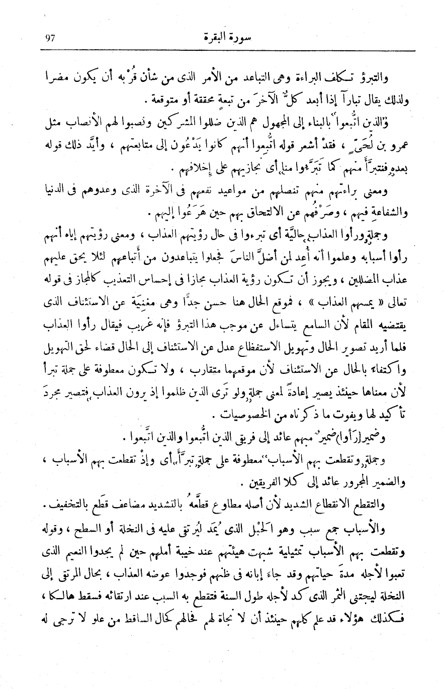 وَجُمْلَةُ وَتَقَطَّعَتْ بِهِمُ الْأَسْبابُ مَعْطُوفَةٌ عَلَى جُمْلَةِ تَبَرَّأَ أَيْ وَإِذْ تَقَطَّعَتْ بِهِمُ الْأَسْبَابُ، وَالضَّمِيرُ الْمَجْرُورُ عَائِدٌ إِلَى كِلَا الْفَرِيقَيْنِ.