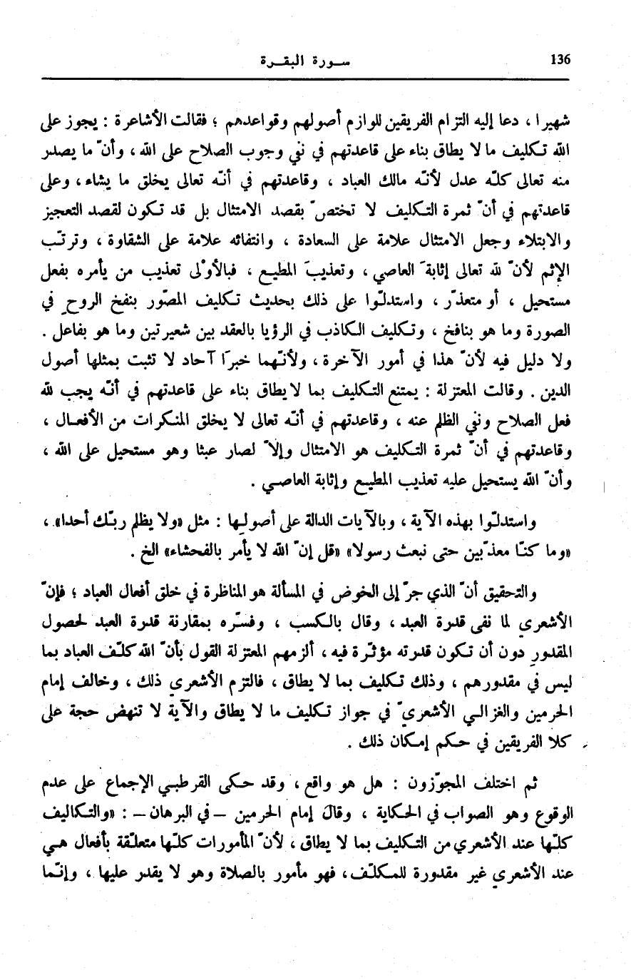 وَالتَّحْقِيقُ أَنَّ الَّذِي جَرَّ إِلَى الْخَوْضِ فِي الْمَسْأَلَةِ هُوَ الْمُنَاظَرَةُ فِي خَلْقِ أَفْعَالِ الْعِبَادِ فَإِنَّ الْأَشْعَرِيَّ لَمَّا نَفَى قُدْرَةَ الْعَبْدِ، وَقَالَ بِالْكَسْبِ، وَفَسَّرَهُ بِمُقَارَنَةِ قُدْرَةِ الْعَبْدِ لِحُصُولِ الْمَقْدُورِ دُونَ أَنْ تَكُونَ قُدْرَتُهُ مُؤَثِّرَةً فِيهِ، أَلْزَمَهُمُ الْمُعْتَزِلَةُ الْقَوْلَ بِأَنَّ اللَّهَ كَلَّفَ الْعِبَادَ بِمَا لَيْسَ فِي مَقْدُورِهِمْ، وَذَلِكَ تَكْلِيفٌ بِمَا لَا يُطَاقُ، فَالْتَزَمَ الْأَشْعَرِيُّ ذَلِكَ، وَخَالَفَ إِمَامُ الْحَرَمَيْنِ وَالْغَزَالِيُّ الأشعريّ فِي جَوَازِ تَكْلِيفِ مَا لَا يُطَاقُ وَالْآيَةُ لَا تَنْهَضُ حجَّة على كلا الْفَرِيقَيْنِ فِي حُكْمِ إِمْكَانِ ذَلِكَ.