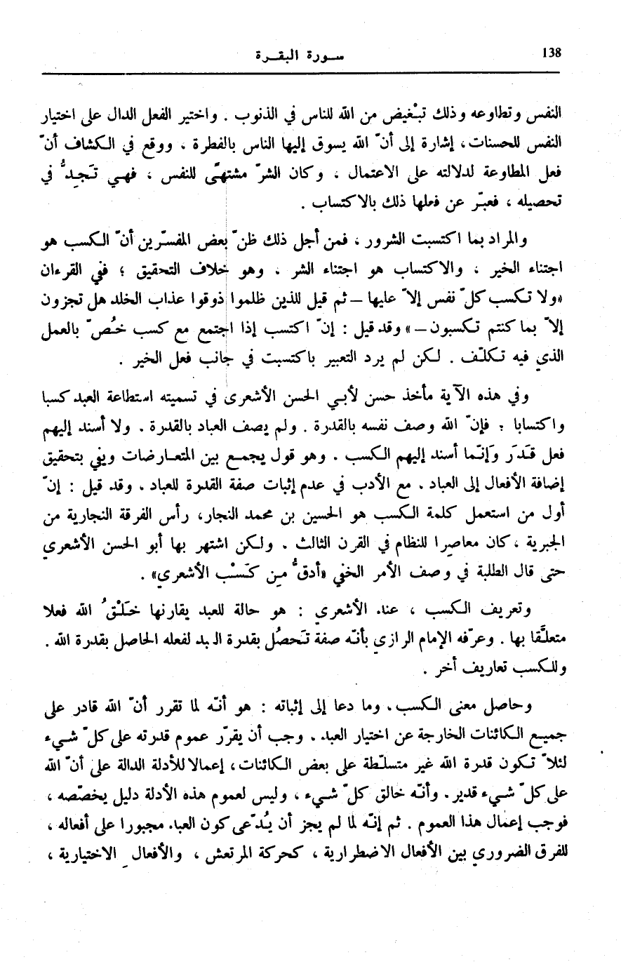 وَفِي هَذِهِ الْآيَةِ مَأْخَذٌ حَسَنٌ لِأَبِي الْحَسَنِ الْأَشْعَرِيِّ فِي تَسْمِيَتِهِ اسْتِطَاعَةَ الْعَبْدِ كَسْبًا وَاكْتِسَابًا فَإِنَّ اللَّهَ وَصَفَ نَفْسَهُ بِالْقُدْرَةِ. وَلَمْ يَصِفِ الْعِبَادَ بِالْقُدْرَةِ، وَلَا أَسْنَدَ إِلَيْهِمْ فِعْلَ قَدَرَ وَإِنَّمَا أَسْنَدَ إِلَيْهِمُ الْكَسْبَ، وَهُوَ قَوْلٌ يَجْمَعُ بَيْنَ الْمُتَعَارِضَاتِ وَيَفِي بِتَحْقِيقِ إِضَافَةِ الْأَفْعَالِ إِلَى الْعِبَادِ، مَعَ الْأَدَبِ فِي عَدَمِ إِثْبَاتِ صِفَةِ الْقُدْرَةِ لِلْعِبَادِ، وَقَدْ قِيلَ: إِنَّ أَوَّلَ مَنِ اسْتَعْمَلَ كَلِمَةَ الْكَسْبِ هُوَ الْحُسَيْنُ بْنُ مُحَمَّدٍ النَّجَّارُ، رَأْسُ الْفِرْقَةِ النَّجَّارِيَّةِ مِنَ الْجَبْرِيَّةِ، كَانَ مُعَاصِرًا لِلنَّظَّامِ فِي الْقَرْنِ الثَّالِثِ، وَلَكِنِ اشْتُهِرَ بِهَا أَبُو الْحَسَنِ الْأَشْعَرِيُّ حَتَّى قَالَ الطَّلَبَةُ فِي وَصْفِ الْأَمْرِ الْخَفِيِّ: «أَدَقُّ مِنْ كَسْبِ الْأَشْعَرِيِّ» .