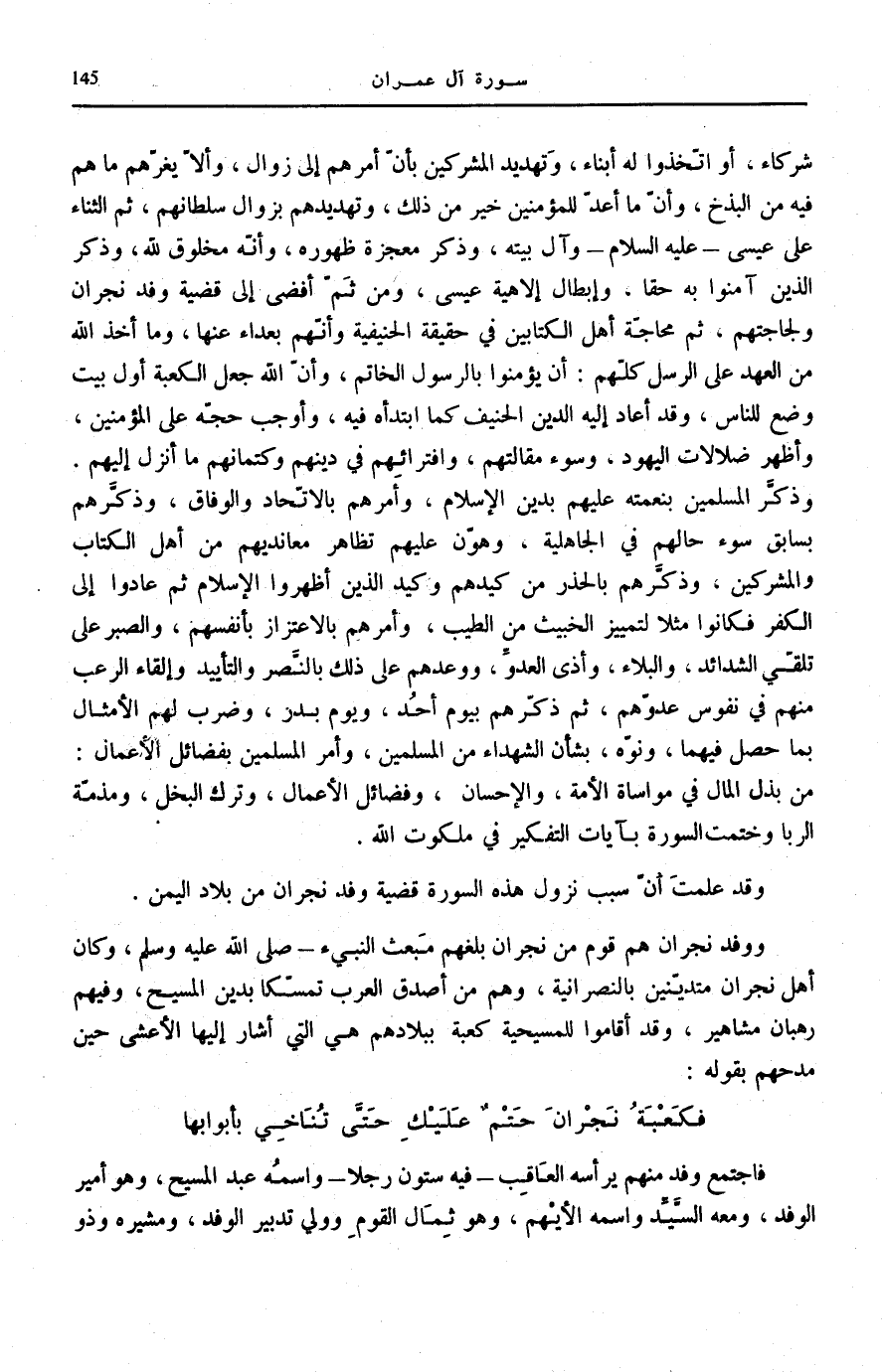 فَكَعْبَةُ نَجْرَان حتم عَلَيْك حَتَّى تُنَاخِي بِأَبْوَابِهَا فَاجْتَمَعَ وَفْدٌ مِنْهُمْ يَرْأَسُهُ الْعَاقِبُ- فِيهِ سِتُّونَ رَجُلًا- وَاسْمُهُ عَبْدُ الْمَسِيحِ، وَهُوَ أَمِيرُ الْوَفْدِ، وَمَعَهُ السَّيِّدُ وَاسْمُهُ الْأَيْهَمُ، وَهُوَ ثِمَالُ الْقَوْمِ وَوَلِيُّ تَدْبِيرِ الْوَفْدِ، وَمُشِيرُهُ وَذُوِِ