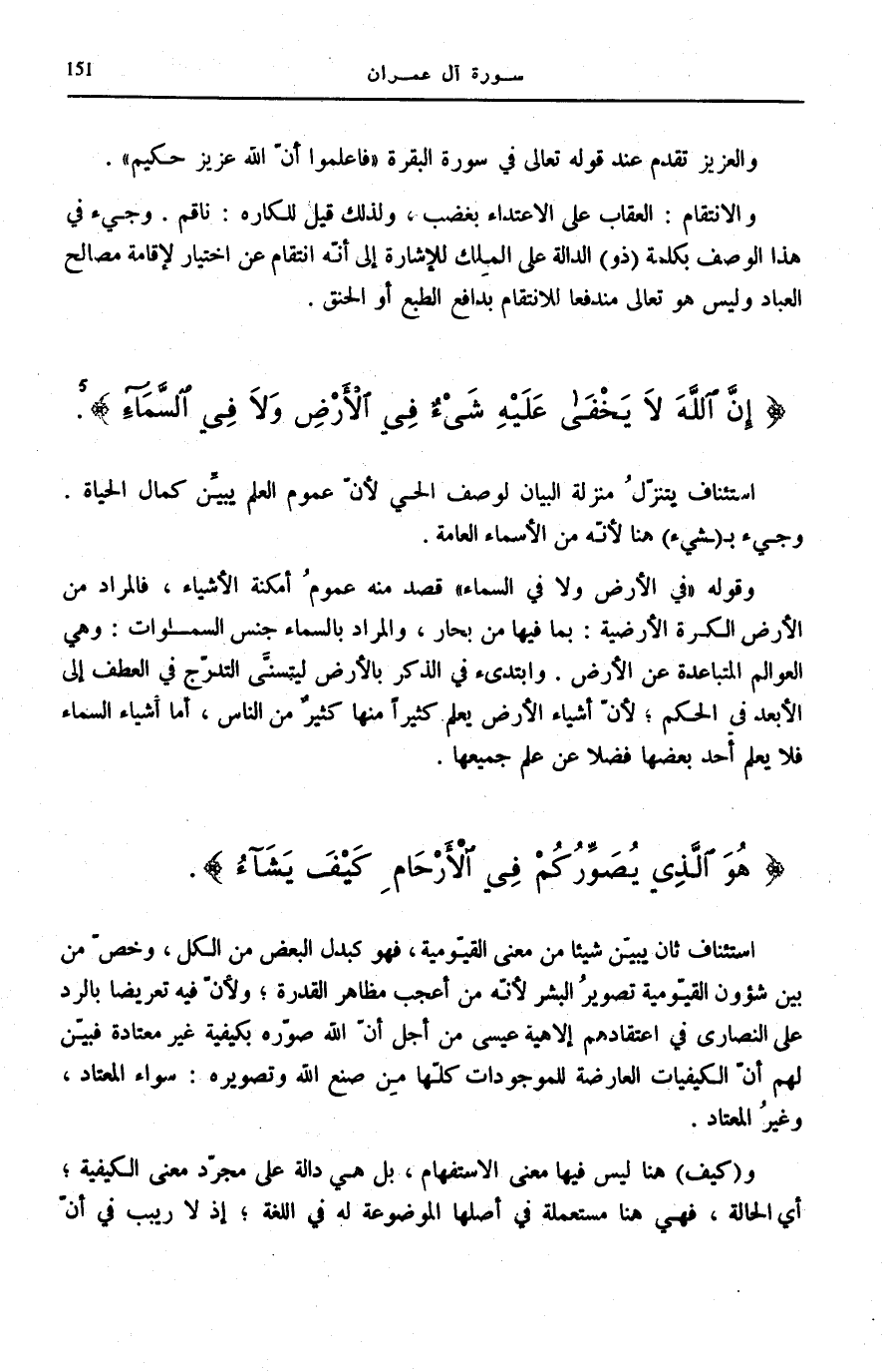 اسْتِئْنَافٌ ثَانٍ يُبَيِّنُ شَيْئًا مِنْ مَعْنَى الْقَيُّومِيَّةِ، فَهُوَ كَبَدَلِ الْبَعْضِ مِنَ الْكُلِّ، وَخُصَّ من بَين شؤون الْقَيُّومِيَّةِ تَصْوِيرُ الْبَشَرِ لِأَنَّهُ مِنْ أَعْجَبِ مَظَاهِرِ الْقُدْرَةِ وَلِأَنَّ فِيهِ تَعْرِيضًا بِالرَّدِّ عَلَى النَّصَارَى فِي اعْتِقَادهم إلاهية عِيسَى مِنْ أَجْلِ أَنَّ اللَّهَ صَوَّرَهُ بِكَيْفِيَّةٍ غَيْرِ مُعْتَادَةٍ فَبَيَّنَ لَهُمْ أَنَّ الْكَيْفِيَّاتِ الْعَارِضَةَ لِلْمَوْجُودَاتِ كُلَّهَا مِنْ صُنْعِ اللَّهِ وَتَصْوِيرِهِ: سَوَاءٌ الْمُعْتَادُ، وَغَيْرُ الْمُعْتَادِ.