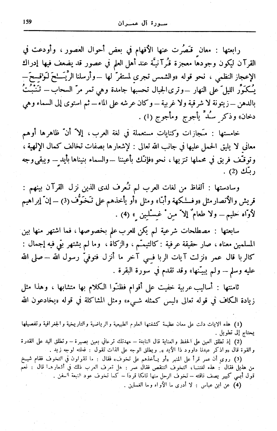رَابِعَتُهَا: مَعَانٍ قَصُرَتْ عَنْهَا الْأَفْهَامُ فِي بَعْضِ أَحْوَالِ الْعُصُورِ، وَأُودِعَتْ فِي الْقُرْآنِ لِيَكُونَ وُجُودُهَا مُعْجِزَةً قُرْآنِيَّةً عِنْدَ أَهْلِ الْعِلْمِ فِي عُصُورٍ قَدْ يَضْعُفُ فِيهَا إِدْرَاكُ الْإِعْجَازِ النَّظْمِيِّ، نَحْوَ قَوْلِهِ: وَالشَّمْسُ تَجْرِي لِمُسْتَقَرٍّ لَها [يس: 38] وَأَرْسَلْنَا الرِّياحَ لَواقِحَ [الْحجر: 22] يُكَوِّرُ اللَّيْلَ عَلَى النَّهارِ [الزمر: 5] وَتَرَى الْجِبالَ تَحْسَبُها جامِدَةً وَهِيَ تَمُرُّ مَرَّ السَّحابِ [النَّمْل: 88] تَنْبُتُ بِالدُّهْنِ [الْمُؤْمِنُونَ: 20] زَيْتُونَةٍ لَا شَرْقِيَّةٍ وَلا غَرْبِيَّةٍ [النُّور: 35] وَكانَ عَرْشُهُ عَلَى الْماءِ [هود: 7] ثُمَّ اسْتَوى إِلَى السَّماءِ وَهِيَ دُخانٌ [فصلت: