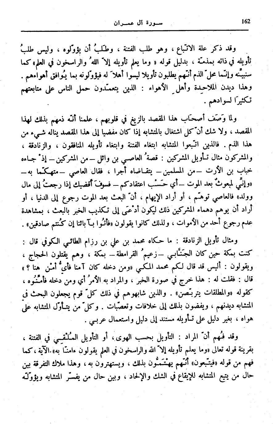 وَيُفْضُونَ بِذَلِكَ إِلَى خِلَافَاتٍ وَتَعَصُّبَاتٍ. وَكُلُّ مَنْ يَتَأَوَّلُ الْمُتَشَابِهَ عَلَى هَوَاهُ، بِغَيْرِ دَلِيلٍ عَلَى تَأْوِيلِهِ مُسْتَنِدٌ إِلَى دَلِيلٍ وَاسْتِعْمَال عَرَبِيٍّ.