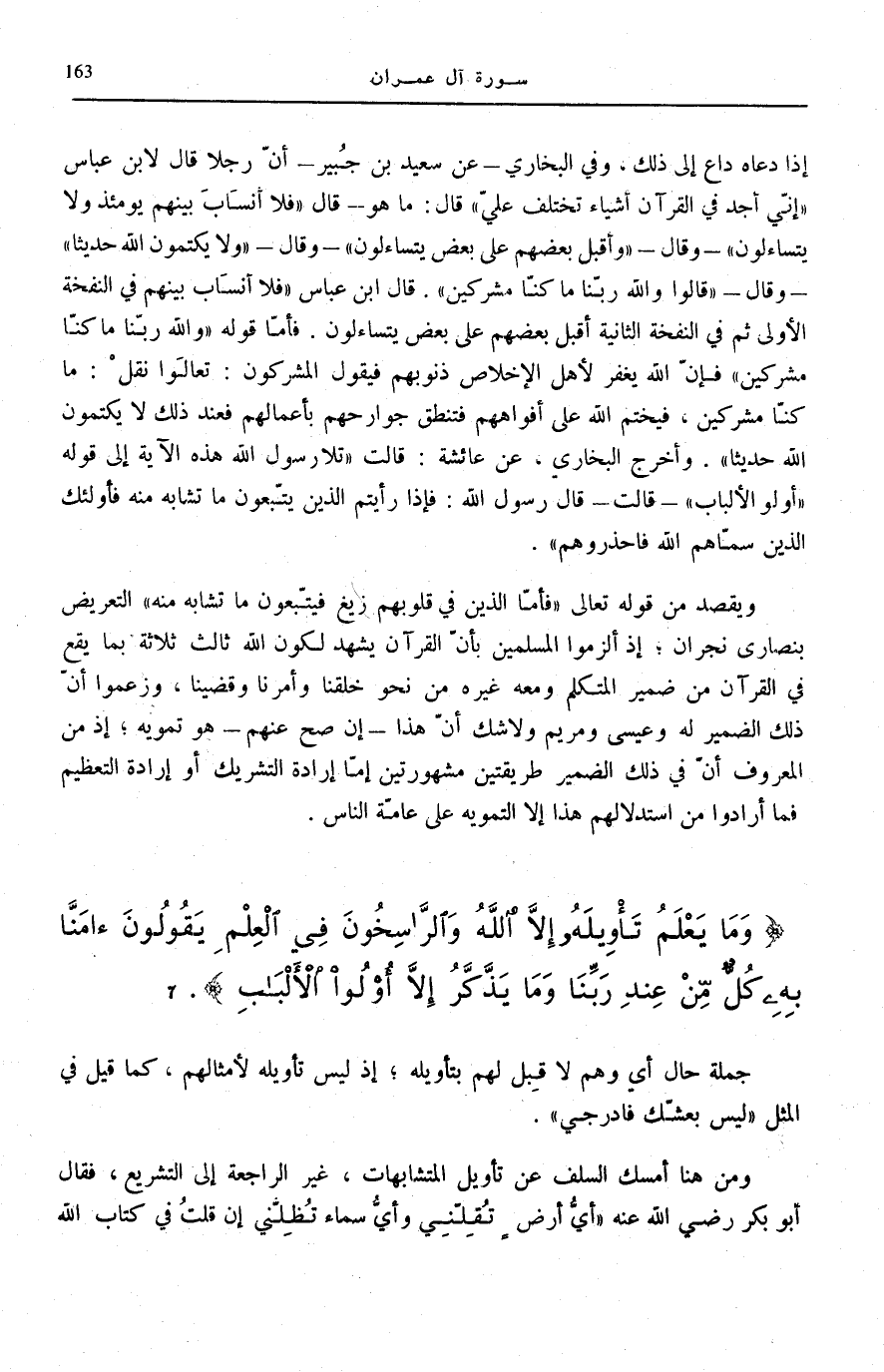 وَما يَعْلَمُ تَأْوِيلَهُ إِلَّا اللَّهُ وَالرَّاسِخُونَ فِي الْعِلْمِ يَقُولُونَ آمَنَّا بِهِ كُلٌّ مِنْ عِنْدِ رَبِّنا وَما يَذَّكَّرُ إِلَّا أُولُوا الْأَلْبابِ.