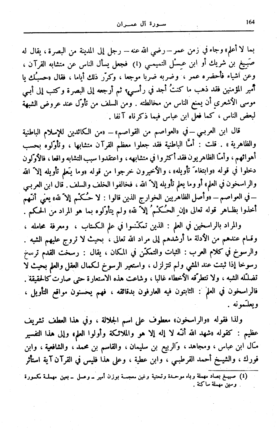 قَالَ ابْنُ الْعَرَبِيِّ فِي «الْعَوَاصِمِ مِنَ الْقَوَاصِمِ» - «مِنَ الْكَائِدِينَ لِلْإِسْلَامِ الْبَاطِنِيَّةُ وَالظَّاهِرِيَّةُ» . قُلْتُ: أَمَّا الْبَاطِنِيَّةُ فَقَدْ جَعَلُوا مُعْظَمَ الْقُرْآنِ مُتَشَابِهًا، وَتَأَوَّلُوهُ بِحَسَبِ أَهْوَائِهِمْ، وَأَمَّا الظَّاهِرِيُّونَ فَقَدْ أَكْثَرُوا فِي مُتَشَابِهِهِ، وَاعْتَقَدُوا سَبَبَ التَّشَابُهِ وَاقِعًا، فَالْأَوَّلُونَ دَخَلُوا فِي قَوْلِهِ: وَابْتِغاءَ تَأْوِيلِهِ، وَالْأَخِيرُونَ خَرَجُوا مِنْ قَوْلِهِ: وَما يَعْلَمُ تَأْوِيلَهُ إِلَّا اللَّهُ وَالرَّاسِخُونَ فِي الْعِلْمِ أَوْ وَمَا يَعْلَمُ تَأْوِيلَهُ إِلَّا اللَّهُ، فَخَالَفُوا الْخَلَفَ وَالسَّلَفَ. قَالَ ابْنُ الْعَرَبِيِّ- «فِي الْعَوَاصِمِ» - «وَأَصْلُ الظَّاهِرِيِّينَ الْخَوَارِجُ الَّذِينَ قَالُوا: لَا حُكْمَ إِلَّا لِلَّهِ» يَعْنِي أَنَّهُمْ أَخَذُوا بِظَاهِرِ قَوْلِهِ تَعَالَى: إِنِ الْحُكْمُ إِلَّا لِلَّهِ وَلَمْ يَتَأَوَّلُوهُ بِمَا هُوَ الْمُرَادُ مِنَ الْحُكْمِ.