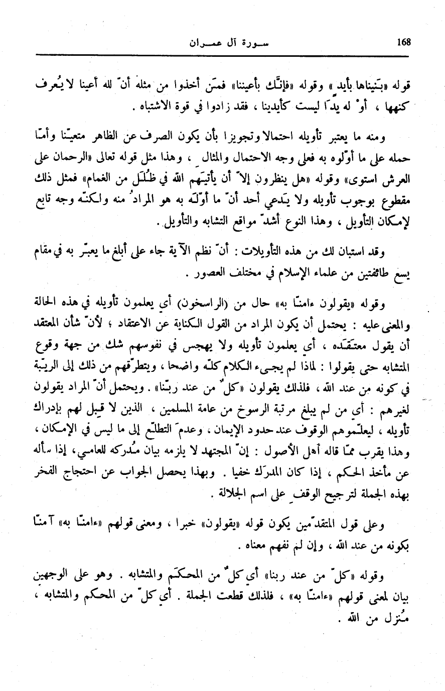 قَوْلِهِ: بَنَيْناها بِأَيْدٍ [الذاريات: 47] وَقَوْلِهِ: فَإِنَّكَ بِأَعْيُنِنا [الطّور: 48] فَمَنْ أَخَذُوا مِنْ مِثْلِهِ أَنَّ لِلَّهِ أَعْيُنًا لَا يُعْرَفُ كُنْهُهَا، أَوْ لَهُ يَدًا لَيْسَتْ كَأَيْدِينَا، فَقَدْ زَادُوا فِي قُوَّةِ الِاشْتِبَاهِ.