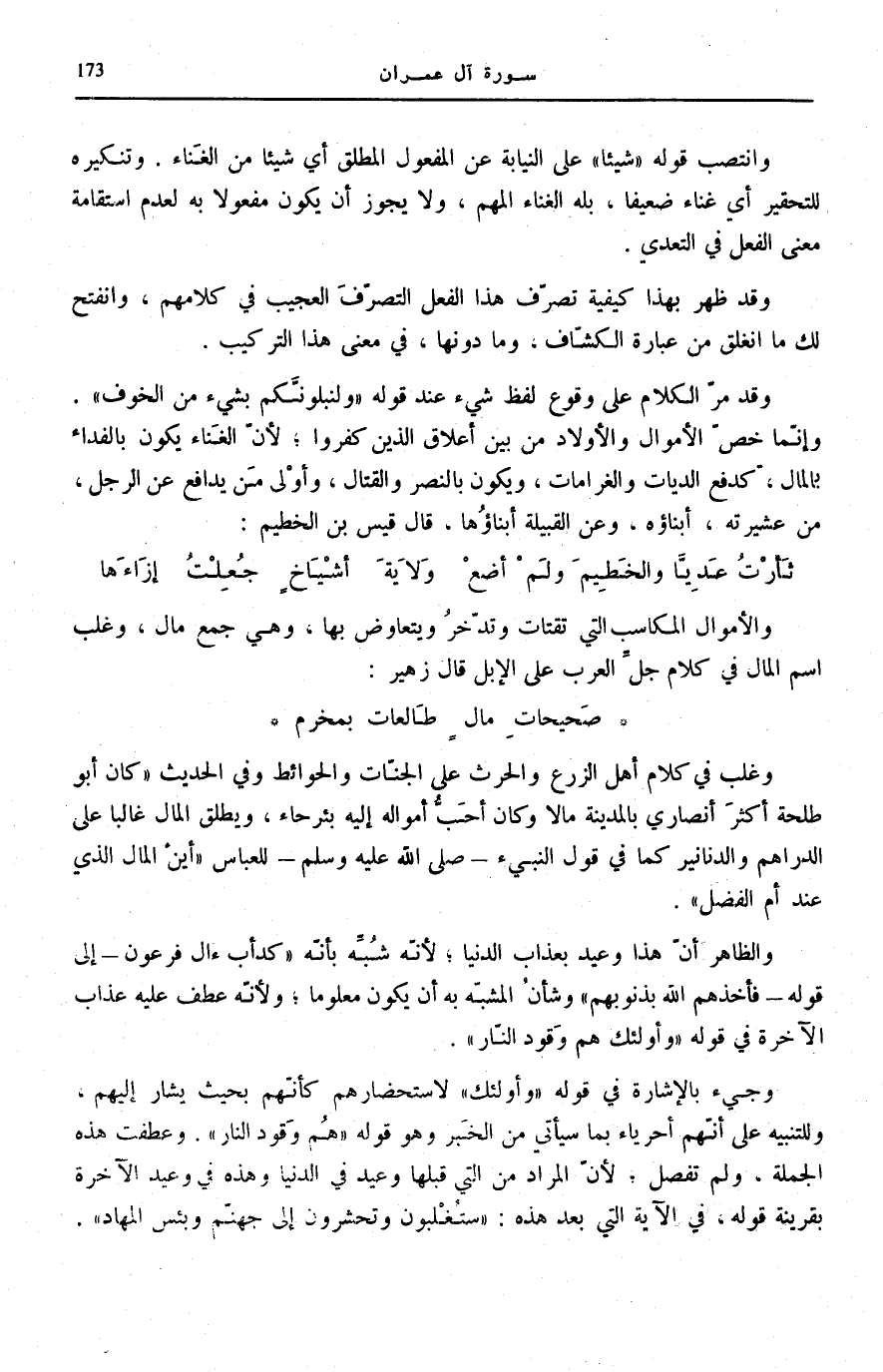 وَقَدْ مَرَّ الْكَلَامُ عَلَى وُقُوعِ لَفْظِ شَيْءٍ عِنْدَ قَوْلِهِ: وَلَنَبْلُوَنَّكُمْ بِشَيْءٍ مِنَ الْخَوْفِ [الْبَقَرَة: 155] . وَإِنَّمَا خَصَّ الْأَمْوَالَ وَالْأَوْلَادَ مِنْ بَيْنِ أَعْلَاقِ الَّذِينَ كَفَرُوا لِأَنَّ الْغَنَاءَ يَكُونُ بِالْفِدَاءِ بِالْمَالِ، كَدَفْعِ الدِّيَاتِ وَالْغَرَامَاتِ، وَيَكُونُ بِالنَّصْرِ وَالْقِتَالِ، وَأَوْلَى مَنْ يُدَافِعُ عَنِ الرَّجُلِ، مِنْ عَشِيرَتِهِ، أَبْنَاؤُهُ، وَعَنِ الْقَبِيلَةِ أَبْنَاؤُهَا. قَالَ قَيْسُ بْنُ الخَطِيمِ: