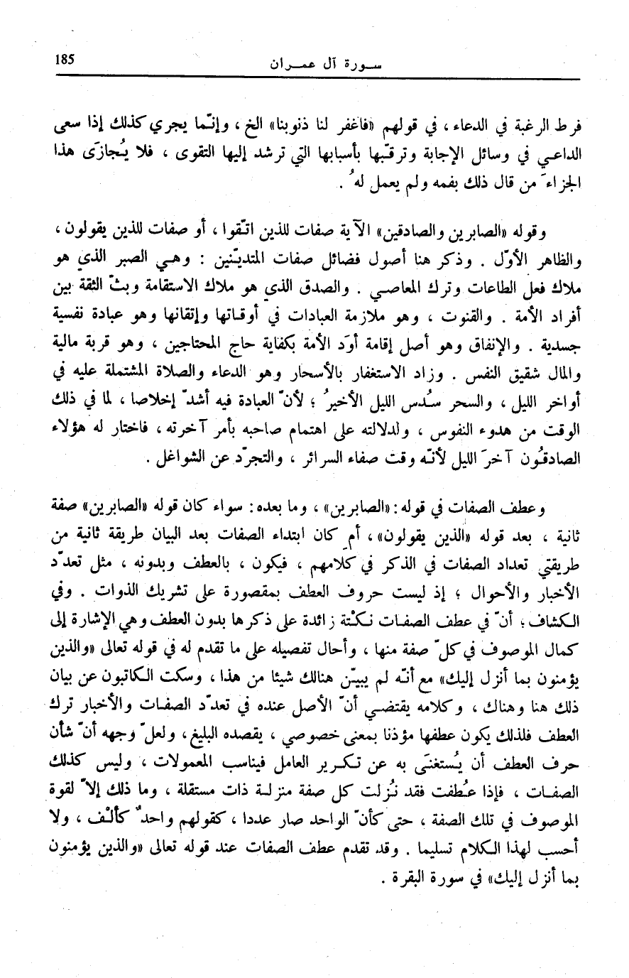 وَقَوْلُهُ: الصَّابِرِينَ وَالصَّادِقِينَ الْآيَةَ صِفَاتٌ لِلَّذِينَ اتَّقَوْا، أَوْ صِفَاتٌ لِلَّذِينَ يَقُولُونَ، وَالظَّاهِرُ الْأَوَّلُ. وَذَكَرَ هُنَا أُصُولَ فَضَائِلِ صِفَاتِ الْمُتَدَيِّنِينَ: وَهِيَ الصَّبْرُ الَّذِي هُوَ مِلَاكُ فِعْلِ الطَّاعَاتِ وَتَرْكِ الْمَعَاصِي. وَالصِّدْقُ الَّذِي هُوَ مِلَاكُ الِاسْتِقَامَةِ وَبَثِّ الثِّقَةِ بَيْنَ أَفْرَادِ الْأُمَّةِ. وَالْقُنُوتُ، وَهُوَ مُلَازَمَةُ الْعِبَادَاتِ فِي أَوْقَاتِهَا وَإِتْقَانُهَا وَهُوَ عِبَادَةٌ نَفْسِيَّةٌ جَسَدِيَّةٌ.
