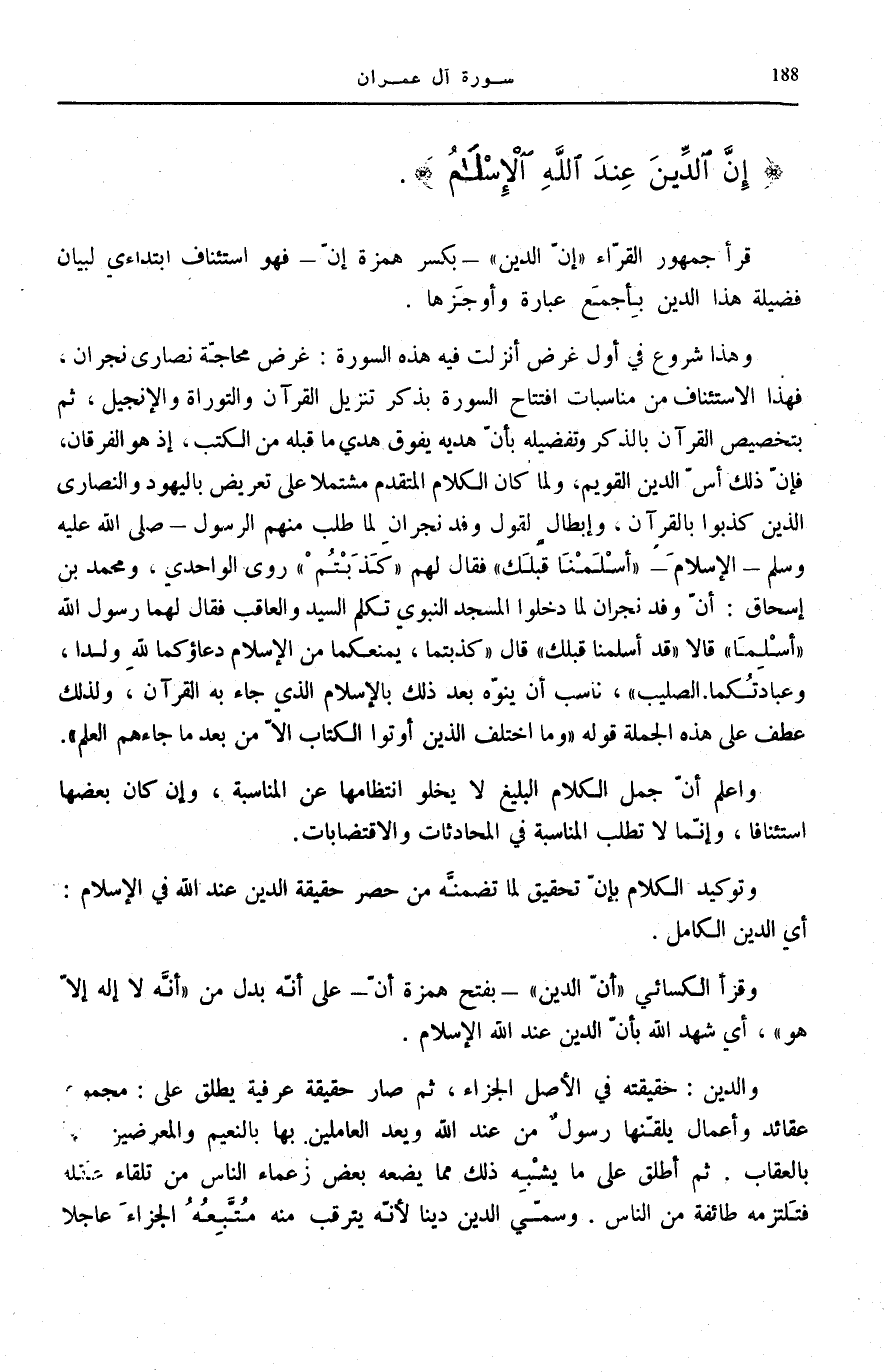 قَرَأَ جُمْهُورُ الْقُرَّاءِ إِنَّ الدِّينَ- بِكَسْرِ هَمْزَةِ إِنَّ- فَهُوَ اسْتِئْنَافٌ ابْتِدَائِيٌّ لِبَيَانِ فَضِيلَةِ هَذَا الدِّينِ بِأَجْمَعِ عِبَارَةٍ وَأَوْجَزِهَا.