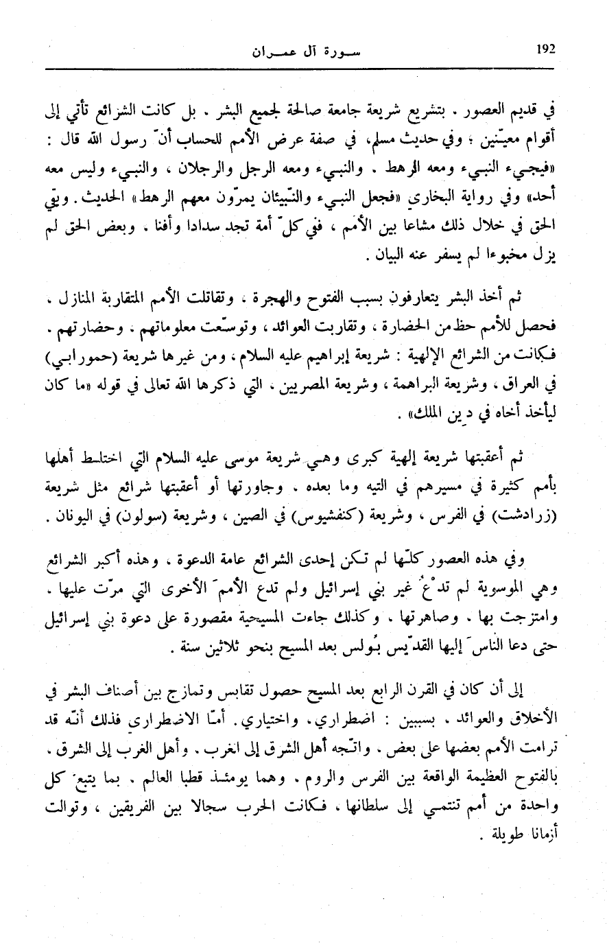 الْحَدِيثَ. وَبَقِيَ الْحَقُّ فِي خِلَالِ ذَلِكَ مَشَاعًا بَيْنَ الْأُمَمِ، فَفِي كُلِّ أُمَّةٍ تَجِدُ سَدَادًا وَأَفْنًا، وَبَعْضُ الْحَقِّ لَمْ يَزَلْ مَخْبُوءًا لَمْ يُسْفِرْ عَنْهُ الْبَيَانُ.