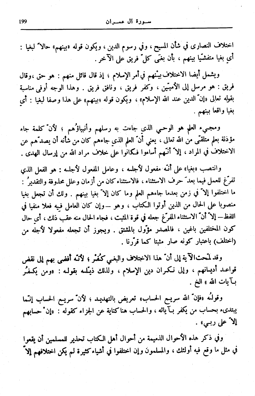 وَيَشْمَلُ أَيْضًا الِاخْتِلَافَ بَيْنَهُمْ فِي أَمْرِ الْإِسْلَامِ إِذْ قَالَ قَائِلٌ مِنْهُمْ: هُوَ حَقٌّ، وَقَالَ فَرِيقٌ: هُوَ مُرْسَلٌ إِلَى الْأُمِّيِّينَ، وَكَفَرَ فَرِيقٌ، وَنَافَقَ فَرِيقٌ. وَهَذَا الْوَجْهُ أَوْفَى مُنَاسَبَةً بِقَوْلِهِ تَعَالَى: إِنَّ الدِّينَ عِنْدَ اللَّهِ الْإِسْلامُ، وَيَكُونُ قَوْلُهُ: بَيْنَهُمْ عَلَى هَذَا وَصفا لبغيا: أَيْ بَغْيًا وَاقِعًا بَيْنَهُمْ.