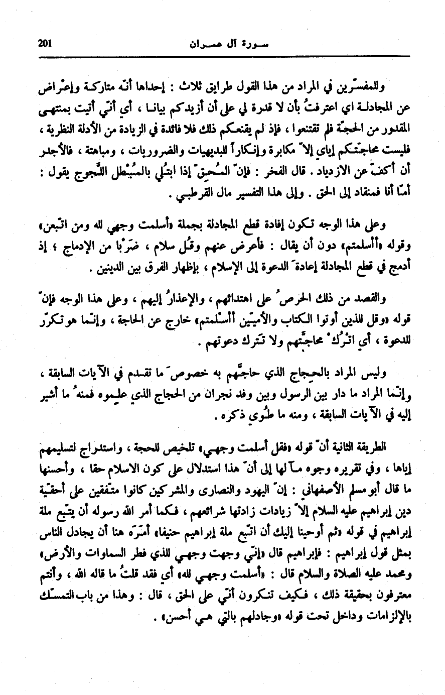 الطَّرِيقَةُ الثَّانِيَةُ أَنَّ قَوْلَهُ: فَقُلْ أَسْلَمْتُ وَجْهِيَ تَلْخِيصٌ لِلْحُجَّةِ، وَاسْتِدْرَاجٌ لِتَسْلِيمِهِمْ إِيَّاهَا، وَفِي تَقْرِيرِهِ وُجُوهٌ مَآلُهَا إِلَى أَنَّ هَذَا اسْتِدْلَالٌ عَلَى كَوْنِ الْإِسْلَامِ حَقًّا، وَأَحْسَنُهَا مَا قَالَ أَبُو مُسْلِمٍ الْأَصْفَهَانِيُّ: إِنَّ الْيَهُودَ وَالنَّصَارَى وَالْمُشْرِكِينَ كَانُوا مُتَّفِقِينَ عَلَى أَحَقِّيَّةِ دِينِ إِبْرَاهِيمَ عَلَيْهِ السَّلَامُ إِلَّا زِيَادَاتٍ زَادَتْهَا شَرَائِعُهُمْ، فَكَمَا أَمَرَ اللَّهُ رَسُولَهُ أَنْ يَتَّبِعَ مِلَّةَ إِبْرَاهِيمَ فِي قَوْلِهِ: ثُمَّ أَوْحَيْنا إِلَيْكَ أَنِ اتَّبِعْ مِلَّةَ إِبْراهِيمَ حَنِيفاً [النَّحْل: 123] أَمَرَهُ هُنَا أَنْ يُجَادِلَ النَّاس بِمثل قَوْله إِبْرَاهِيمَ: فَإِبْرَاهِيمُ قَالَ: إِنِّي وَجَّهْتُ وَجْهِيَ لِلَّذِي فَطَرَ السَّماواتِ وَالْأَرْضَ [الْأَنْعَام: 79]