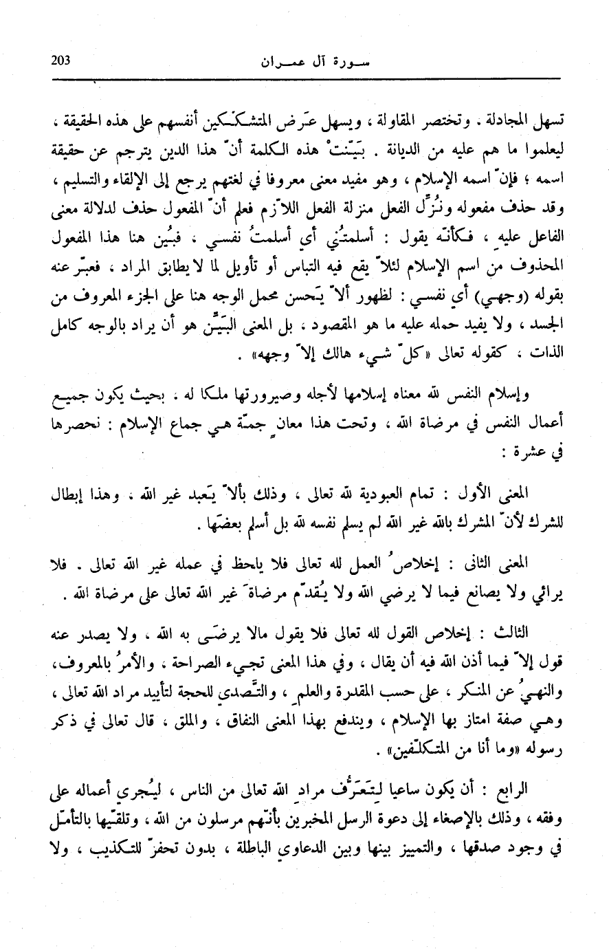 وَإِسْلَامُ النَّفْسِ لِلَّهِ مَعْنَاهُ إِسْلَامُهَا لِأَجْلِهِ وَصَيْرُورَتُهَا مِلْكًا لَهُ، بِحَيْثُ يَكُونُ جَمِيعُ أَعْمَالِ النَّفْسِ فِي مَرْضَاةِ اللَّهِ، وَتَحْتَ هَذَا مَعَانٍ جَمَّةٌ هِيَ جِمَاعُ الْإِسْلَامِ: نَحْصُرُهَا فِي عَشَرَةٍ: